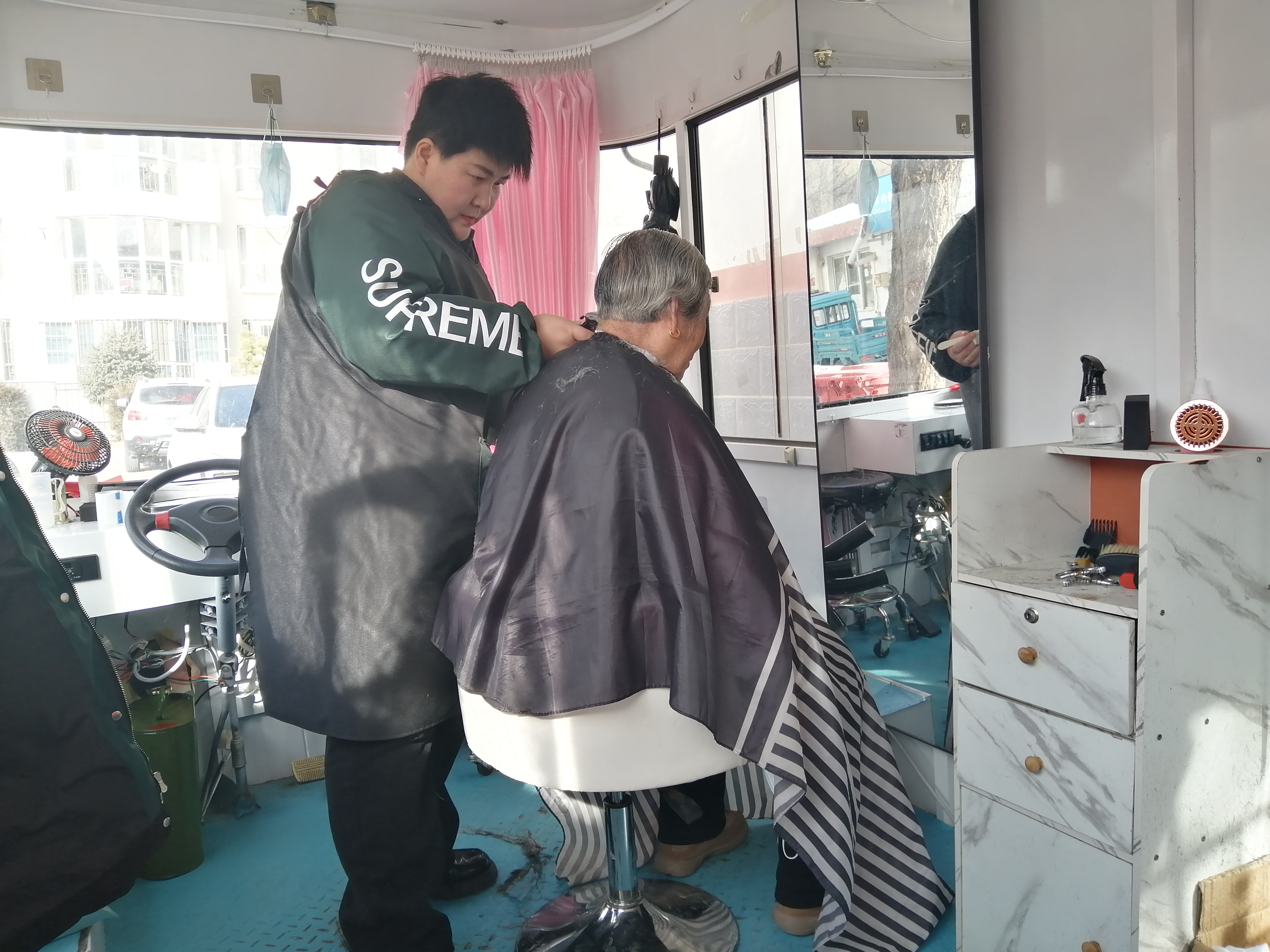 经过1年多的经营,快剪车为马向荣提供了稳定的收入来源,也为东海园区居民和周边小区住户提供了便捷的服务。东海园区常住人口数千名,其中不乏行动不便的居民。2025年,有人询问马向荣可不可以上门服务,那是家住东海园区18号楼一位腿部受伤的中年人。“当时我想这人就在附近,不过是爬几层楼,本来快剪车也有便民的性质,就同意了,从那以后我就开始了上门服务。”为了避免顾客上门时她不在,马向荣将自己的联系电话和添加好友的微信二维码打印出来贴在车身上,如果有人需要上门服务就线上预约或电话沟通。