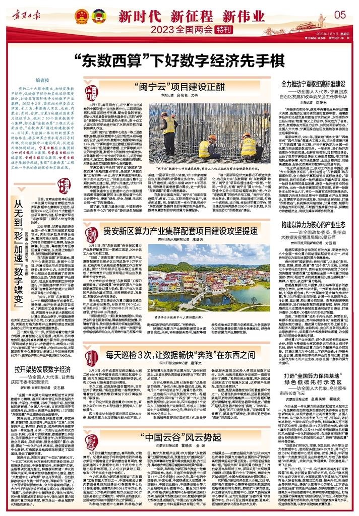 党的二十大报告提出,加快发展数字经济,促进数字经济和实体经济深度融合,打造具有国际竞争力的数字产业集群。2022年2月,国家相关部委在京津冀、长三角、粤港澳大湾区、成渝、内蒙古、贵州、甘肃、宁夏8地建设国家算力枢纽节点,规划了10个国家数据中心集群,标志着“东数西算”工程正式全面启动。“东数西算”通过构建数据中心、云计算、大数据一体化的新型算力网络体系,将东部算力需求有序引导到西部,优化数据中心建设布局、促进东西部协同联动。宁夏日报报业集团联合四川日报报业集团、内蒙古日报社传媒集团、贵州日报报业集团、甘肃日报社开展联动报道,展现“东数西算”工程实施一年来的最新探索和实践成果。
