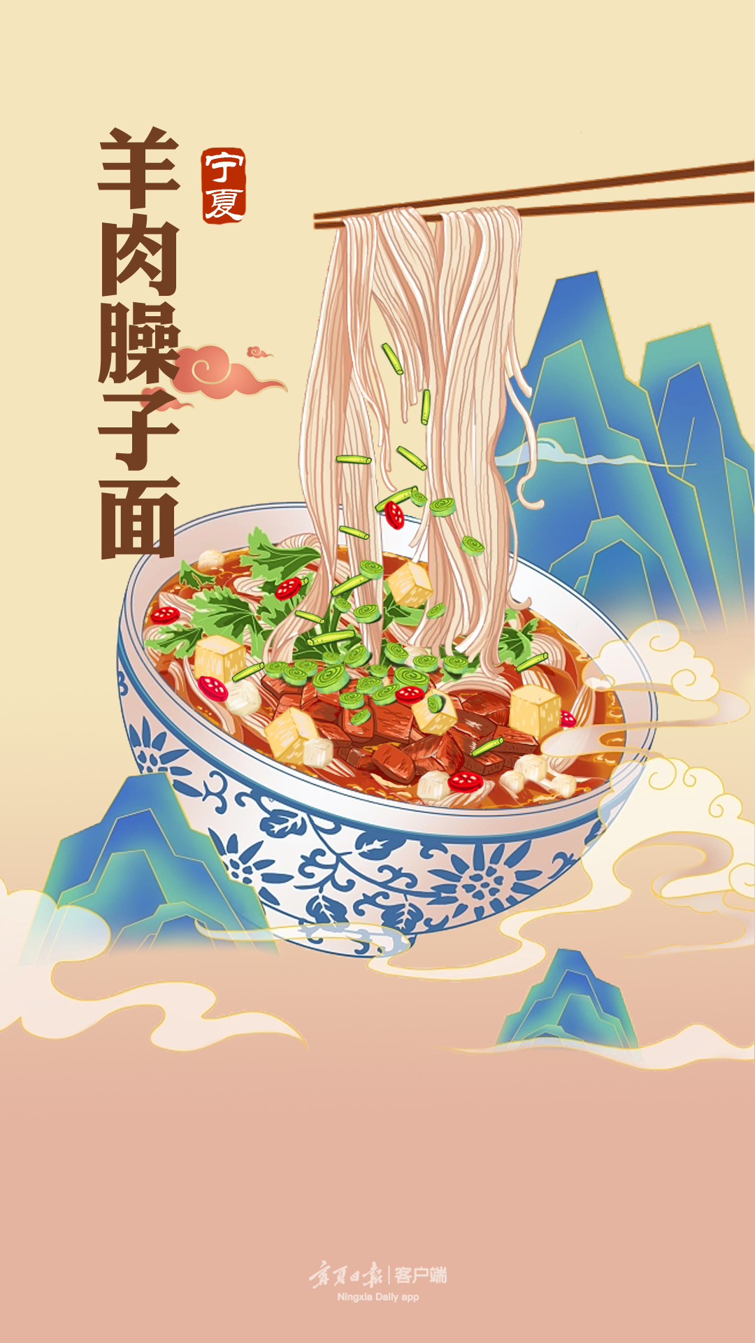宁夏人爱吃面,一日三餐里,除了早餐,午餐和晚餐必定是一顿米饭一顿面。宁夏的面食种类也非常多,常听人说:“来宁夏吃面,一天一碗,一个月可以不重样!”而羊肉臊子面则是宁夏面食里的NO.1,洁白柔韧的细丝长面配上臊子红汤,看一眼就让人食欲大开。