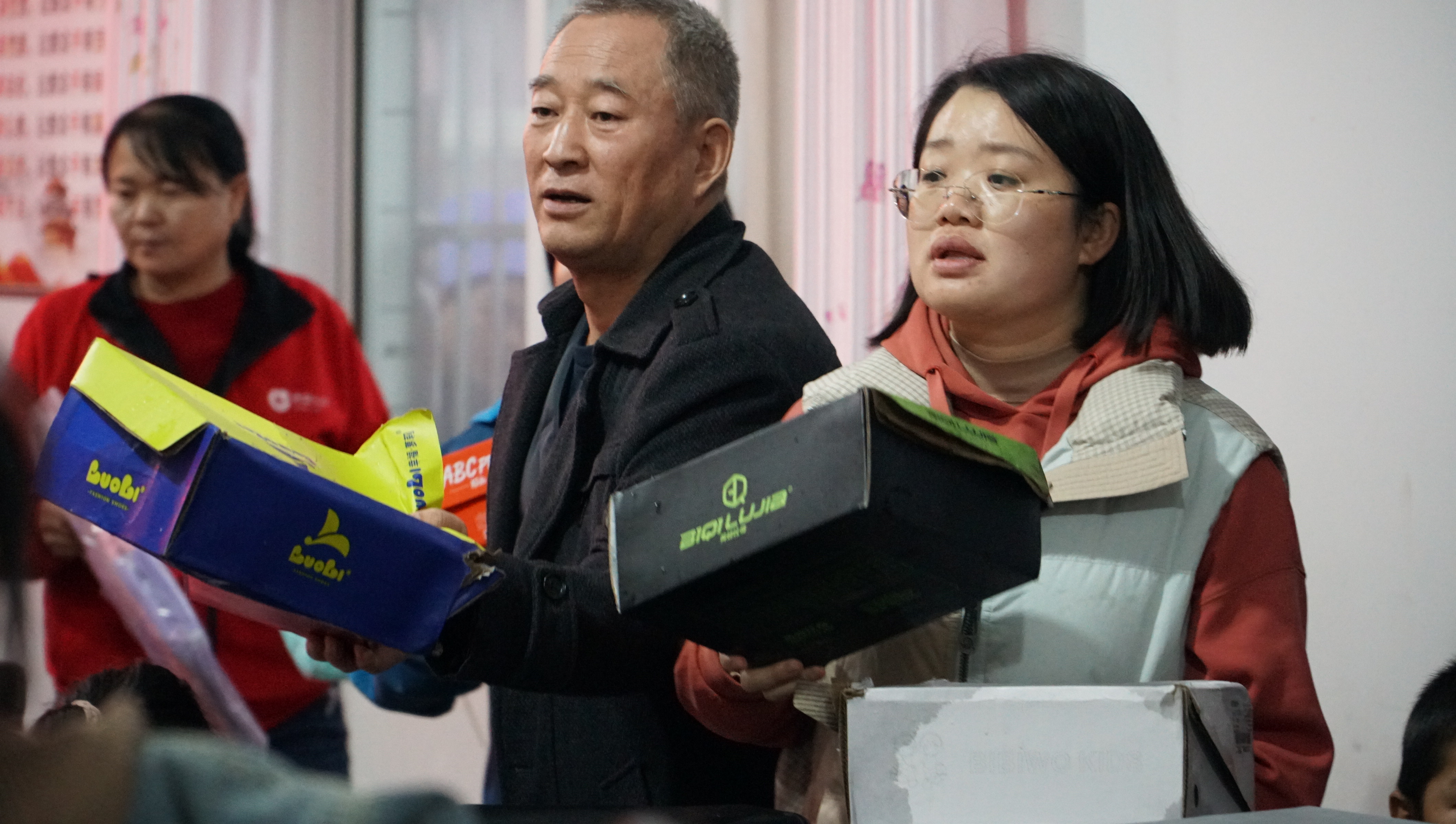 “盒子都湿成这样了,鞋还能穿吗?”8岁的小女孩马蓉一边抱怨一边迫不及待地打开盒子。旁边的爷爷轻轻打了下她的小手,叮嘱说:“咋这么不懂事?叔叔阿姨们冒着大雨从银川赶过来的,还饿着肚子咧。”马蓉愣了一下,很快看到了红蓝相间的运动鞋。“新鞋,没有打湿。”她惊喜地叫道,脸上挂满幸福,又忙不迭地去拆棉衣外包装。