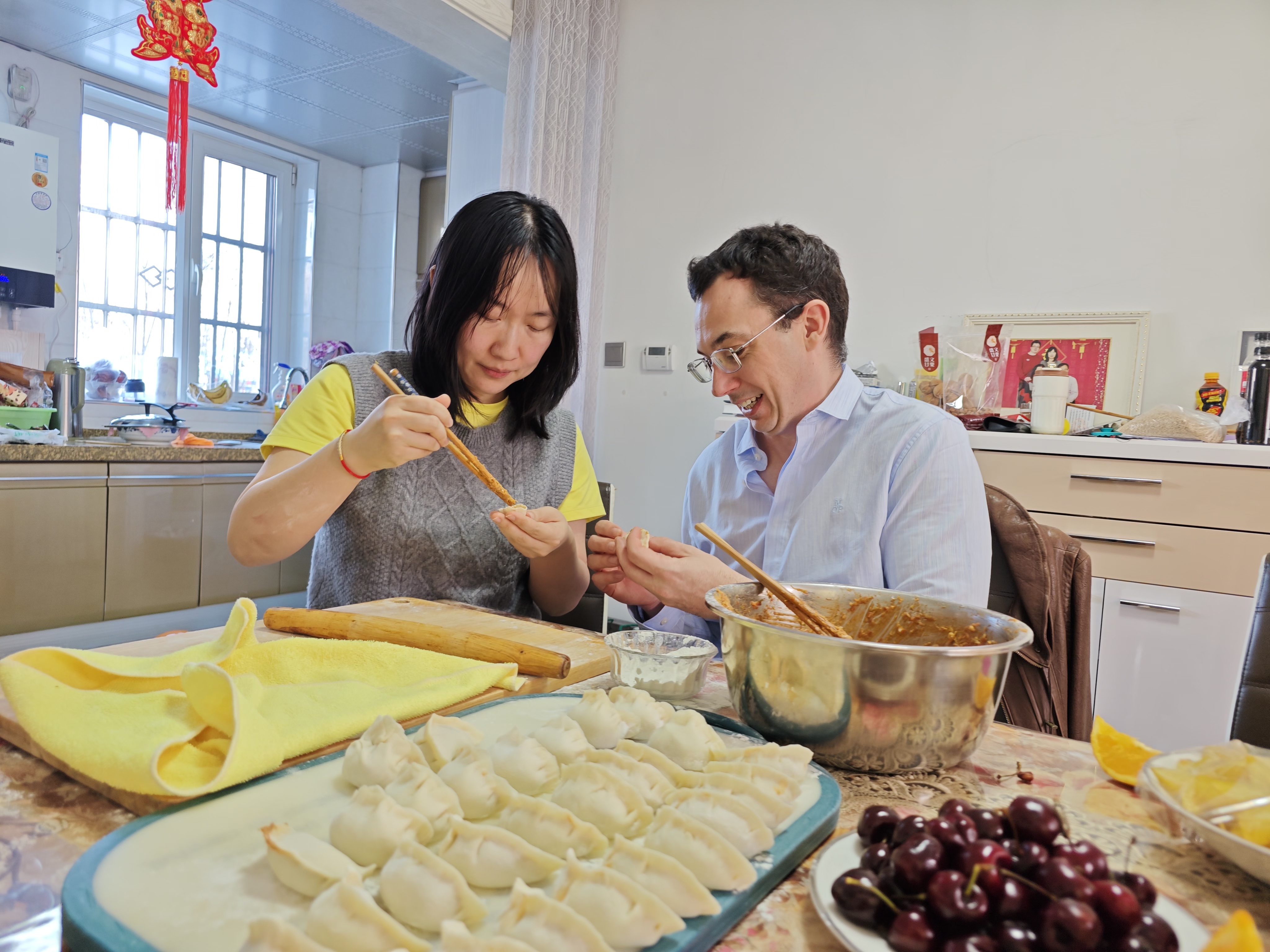 临近中午,准备工作都做好了。理查德拿起擀面杖,按压面剂子,滚动擀面杖,转动面皮……动作娴熟,一张张饺子皮就这样诞生了,妻子和岳母在一旁包饺子,3岁的小女儿露娜坐在餐桌旁用手摆弄着面皮,像模像样地“包饺子”。