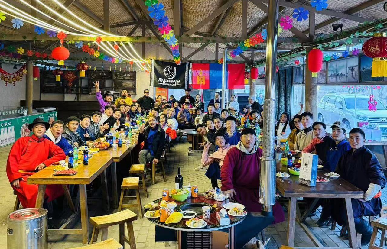 当天,互市大集用灯笼、拉花、风车和彩灯装饰一新,长条桌上摆着蒙式烤全羊、糖果、饮料……演员们围坐在一起,唱着欢快的歌曲,品尝中国饺子,零点钟声响起时,景区上空亮起的烟花让他们兴奋不已。
