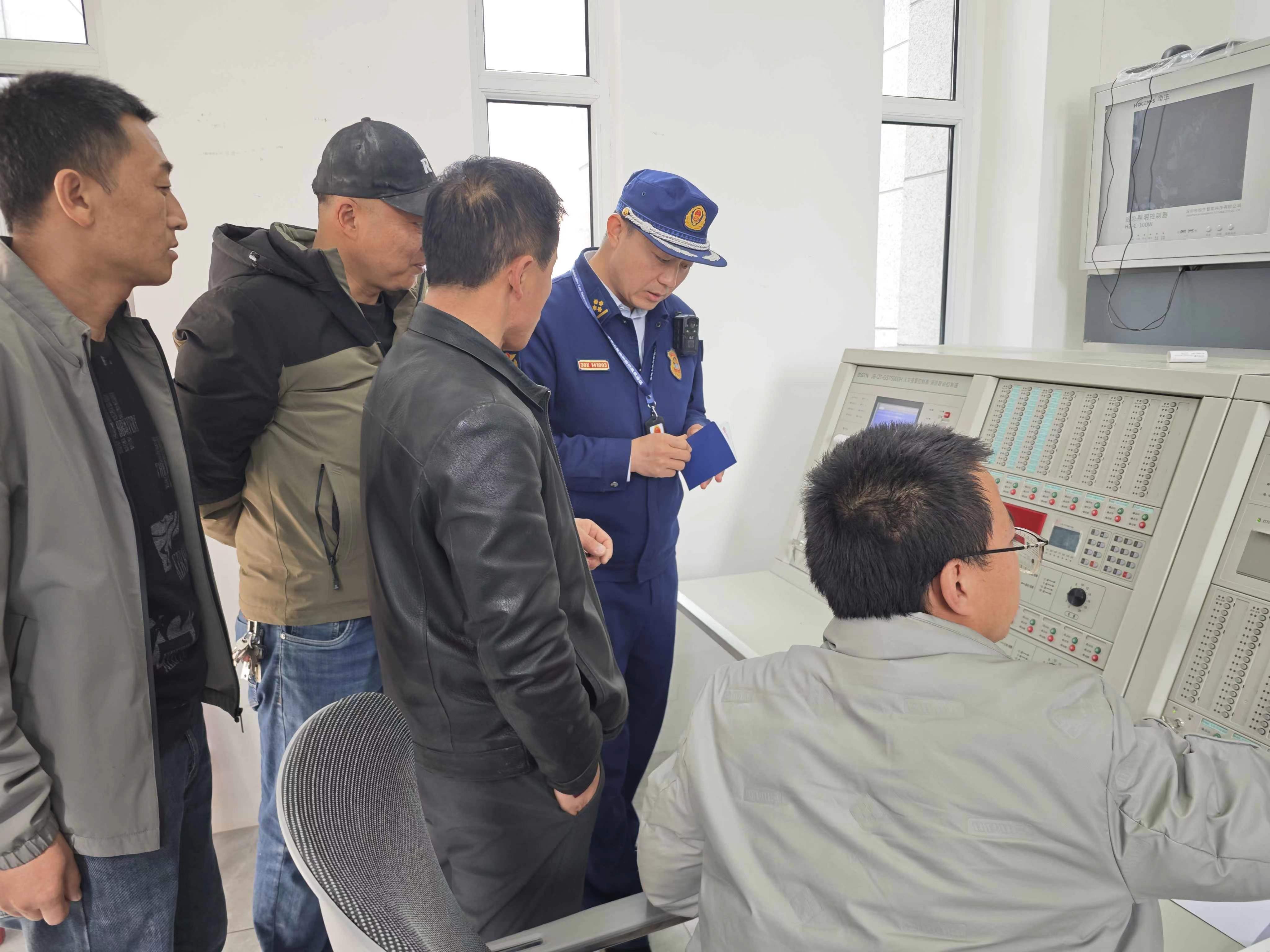 防火监督员对新建高层住宅小区进行消防安全检查。