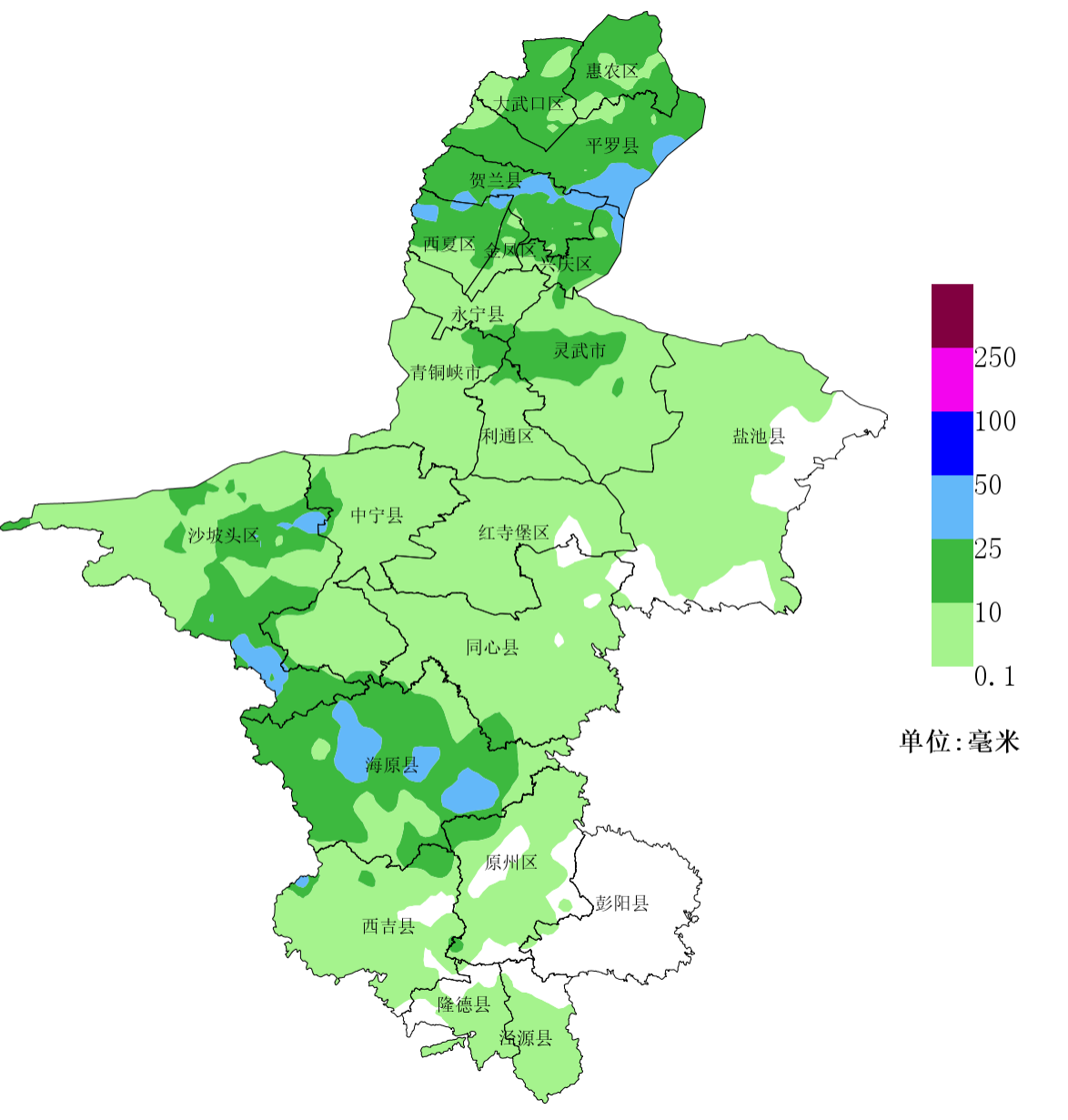 银川市大部降雨量在1-45毫米,最大累计降雨量出现在兴庆区月牙湖乡三眼井沟为45毫米,最大小时雨强出现在西夏区贺兰山西路街道南梁枸杞园为15.9毫米/小时。银川气象站降雨量为10毫米。