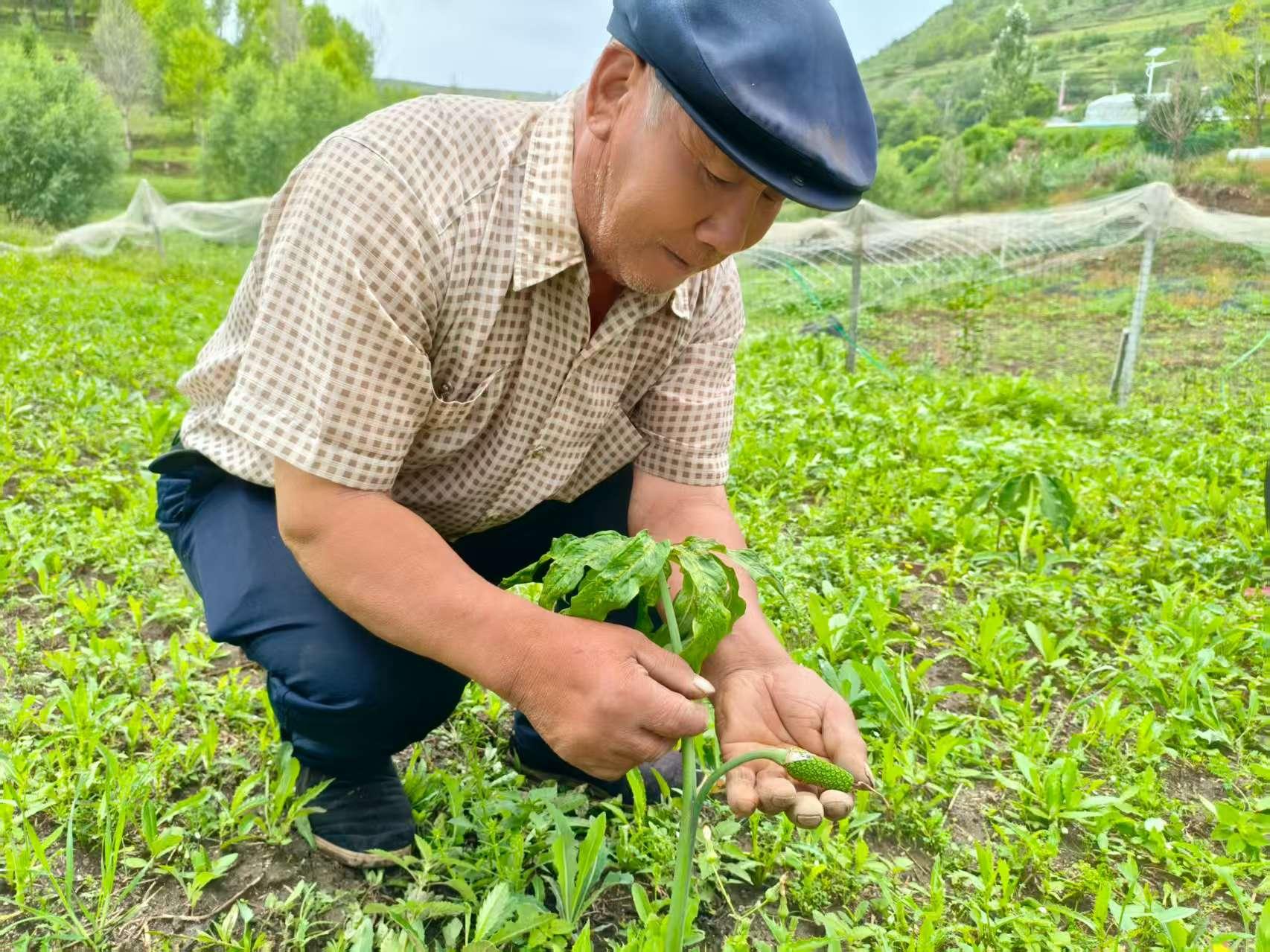 观庄乡林沟村村民杨旺正在检查中药天南星的长势。