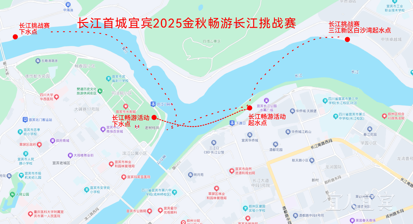 若你渴望挑战极限,“长江挑战赛”(线路距离约 4500 米)便是勇者的舞台。从五新起步广场启程,先逐浪岷江,再跨越金沙江,最终征服长江。蜿蜒水道中,每一次摆臂都是与三江历史的共鸣,每一次换气都满含对自然的敬畏。更有个人赛与团体接力赛相映成趣,让赛场既有 “独闯三江” 的豪情,也有 “同心战波涛” 的温情。
