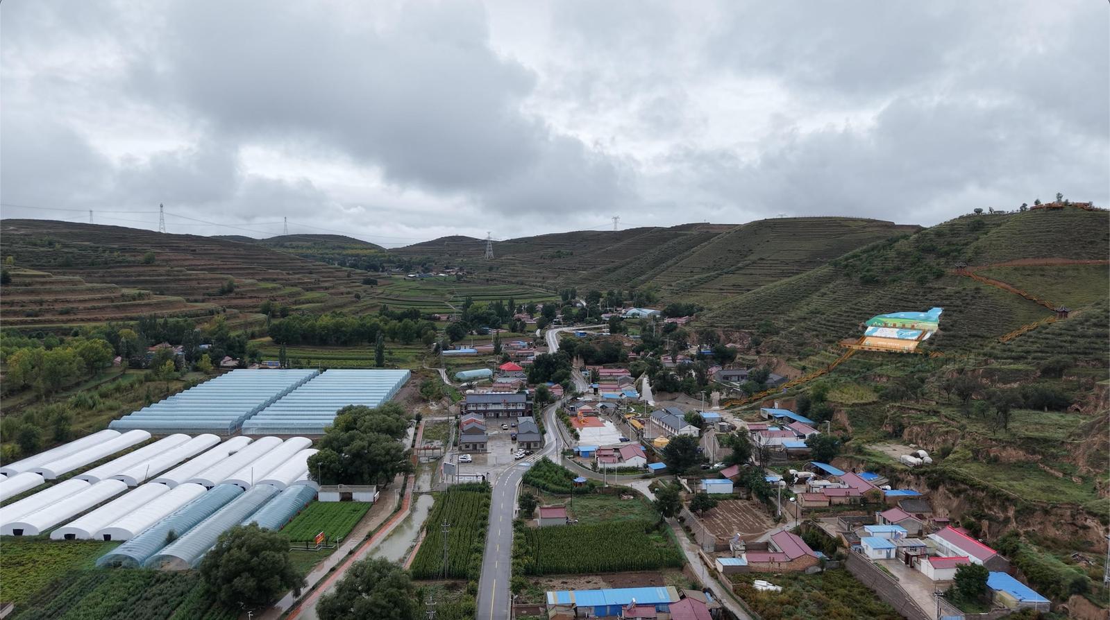 在黄土高原的褶皱里,甘井村的温室大棚像一片片擦亮了的银鳞,沿沟铺展。黄河水被泵站提上来,顺着支渠毛沟汩汩淌进棚口,蘑菇撑伞、番茄挂红、辣椒挂绿。村民腰挎塑料筐,猫着身穿梭垄间,采摘、分拣、装车,把高原的“鲜粮”直接运往远方的餐桌。