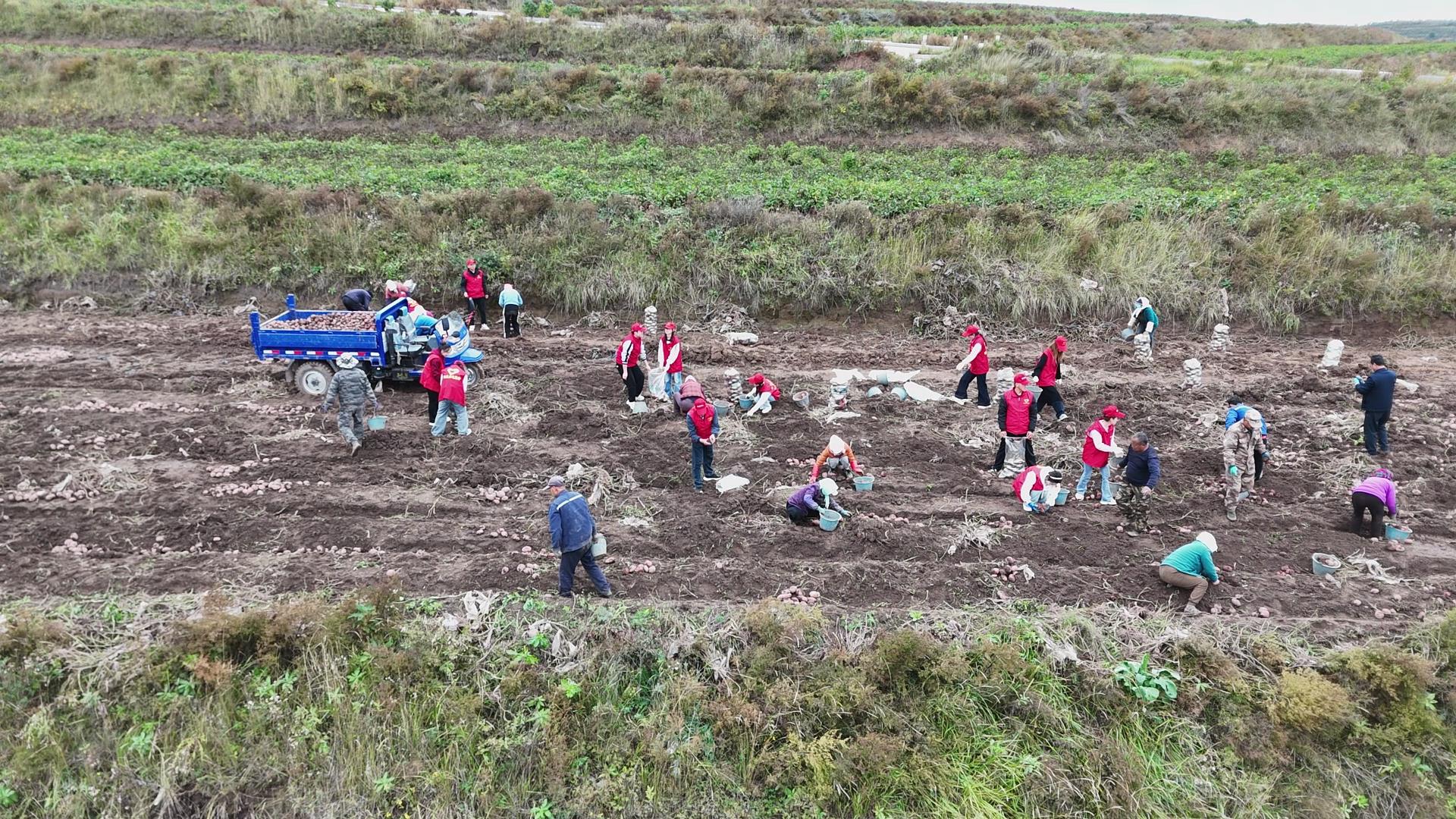 10月14日,在观庄乡马铃薯种植基地,大型农机在田垄间轰鸣穿梭,一个个饱满的马铃薯随之破土而出,铺满地面。紧随其后的,是身穿红色志愿服的党员干部与农户们忙碌的身影。他们分工协作,弯腰拾捡、装袋运输,动作麻利,干劲十足。汗水浸湿了衣衫,泥土沾满了裤脚,但田间洋溢的欢声笑语,却真切地诉说着抢收的效率和丰收的喜悦。