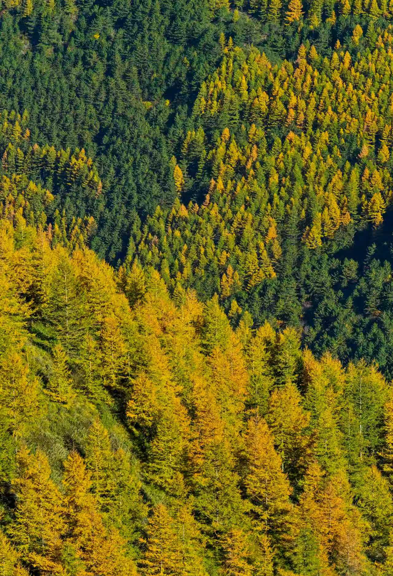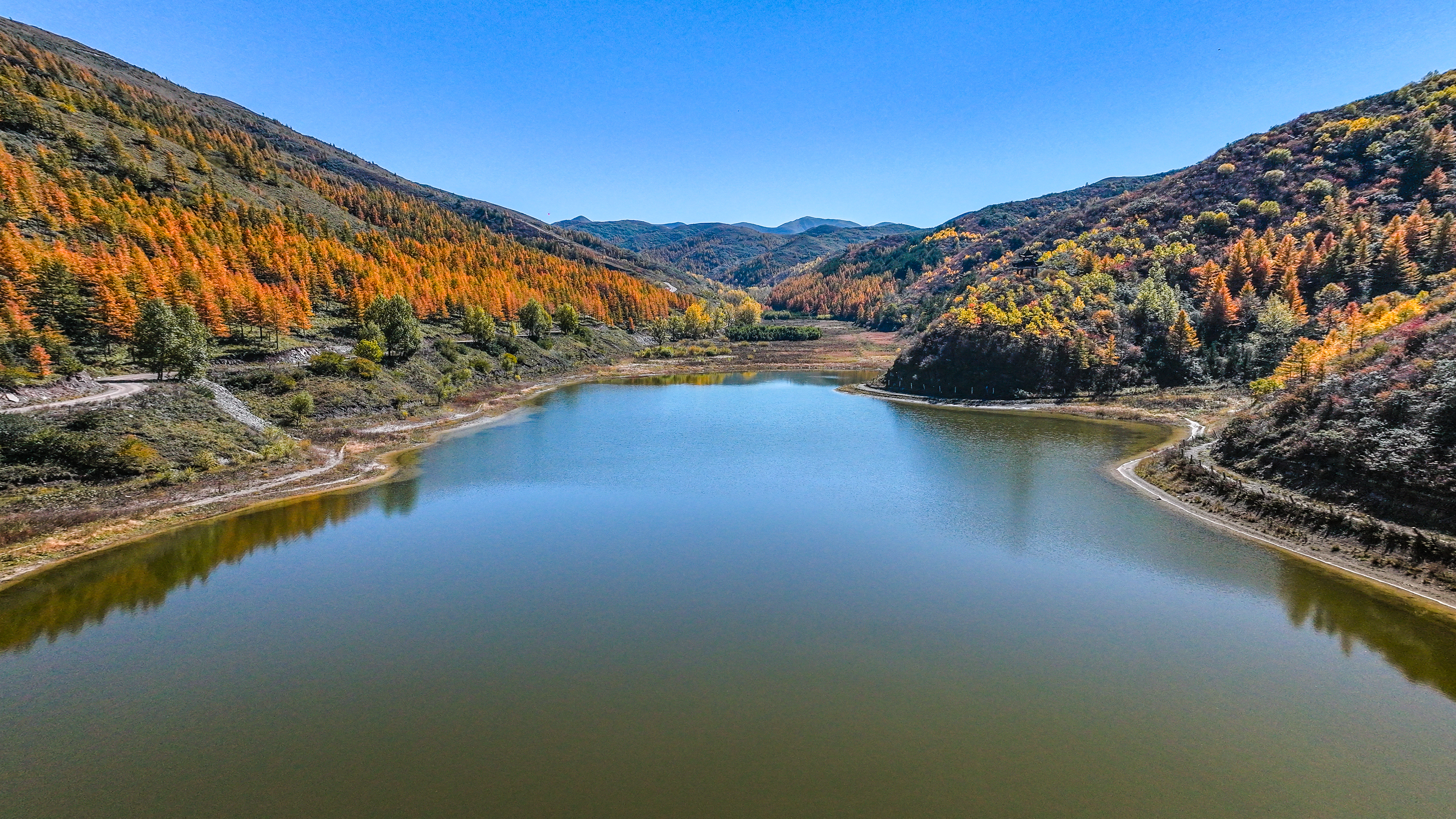 如镜的湖面映照出秋日群山的斑斓色彩,金黄炽烈的阔叶林与墨绿沉稳的松柏带在虚实之间交织得更加绚烂。本报记者 安磊 摄