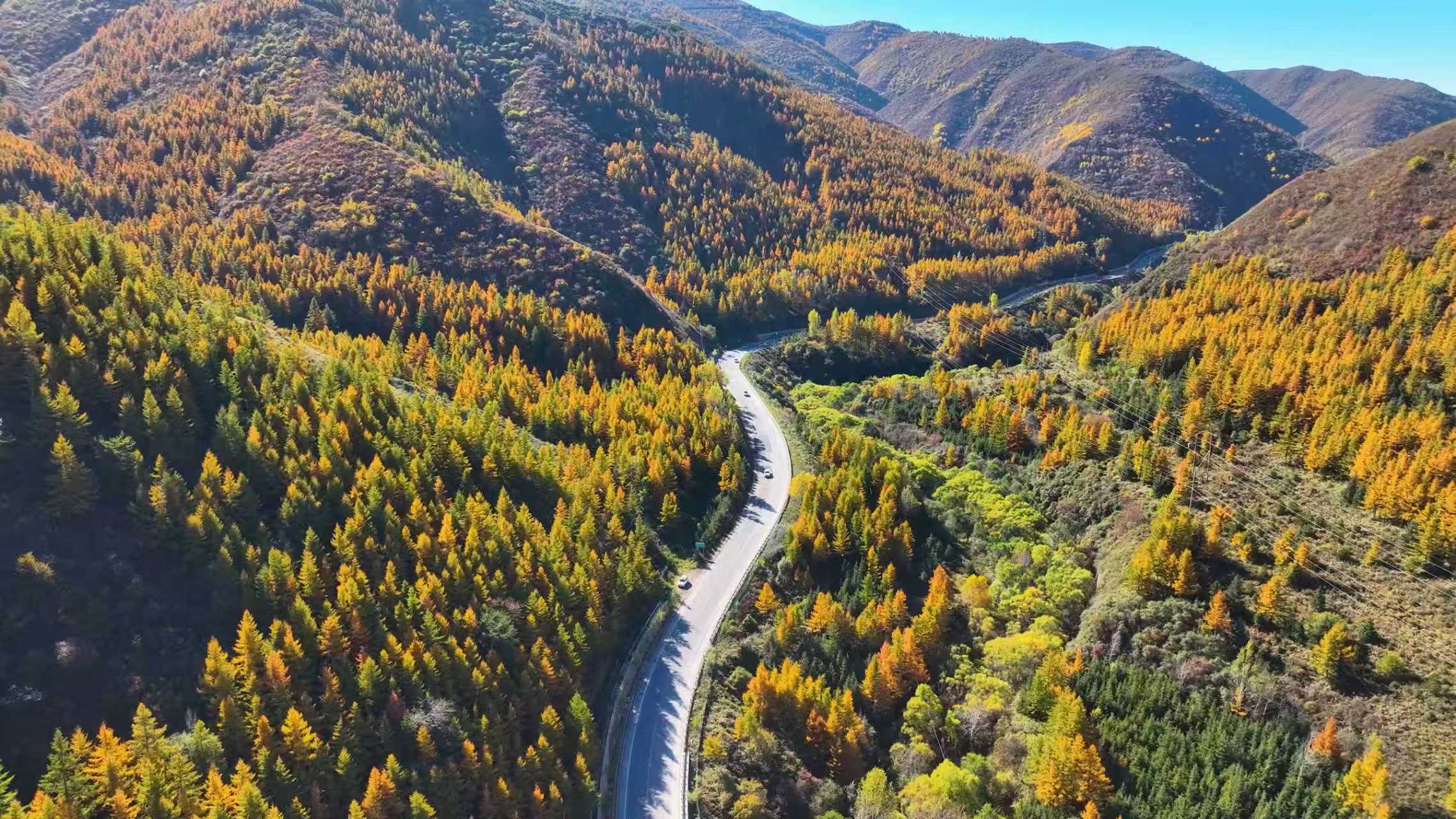 秋色作颜料,山峦为画布,道路蜿蜒,驶入一片绚烂的梦境。本报记者 王曦 摄
