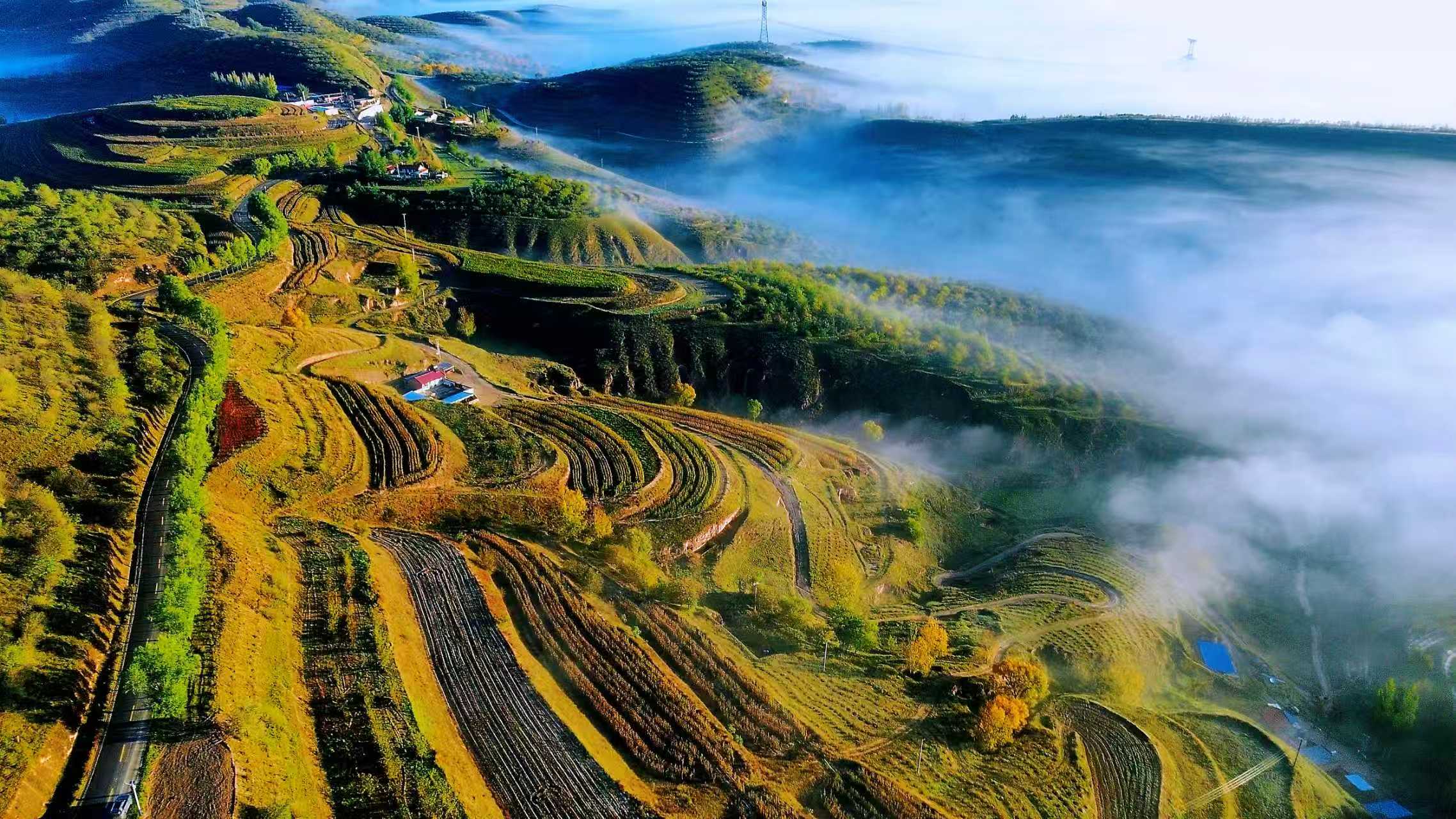 秋日的梯田上,斑斓的色块与蜿蜒的曲线,宛如自然的五线谱。本报通讯员 马玉学 摄