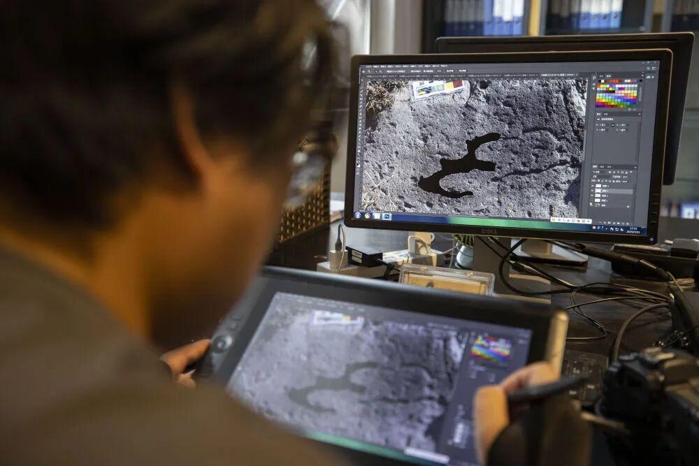 2025年7月23日,工作人员在绘制贺兰山岩画电子线描图。新华社记者杨植森摄