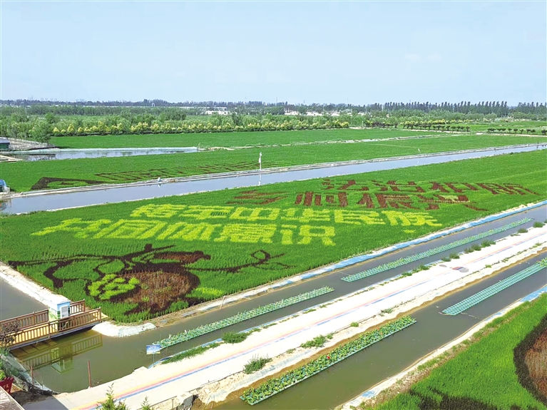 贺兰县稻渔空间生态观光园里的铸牢中华民族共同体意识稻田画。