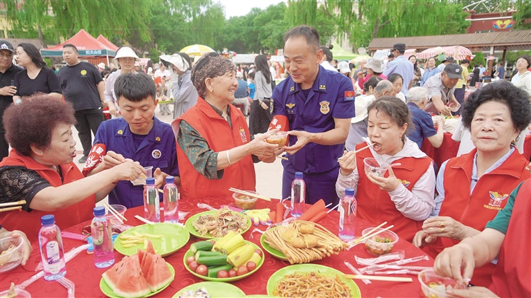 在吴忠市利通区金星镇金花园社区邻居节“百家宴”上,各族群众聚在一起炸馓子、做月饼,“百家宴”已由20多年前的几家邻居“凑桌吃饭”,发展成为涵盖便民服务、非遗集市等诸多内容的盛会;