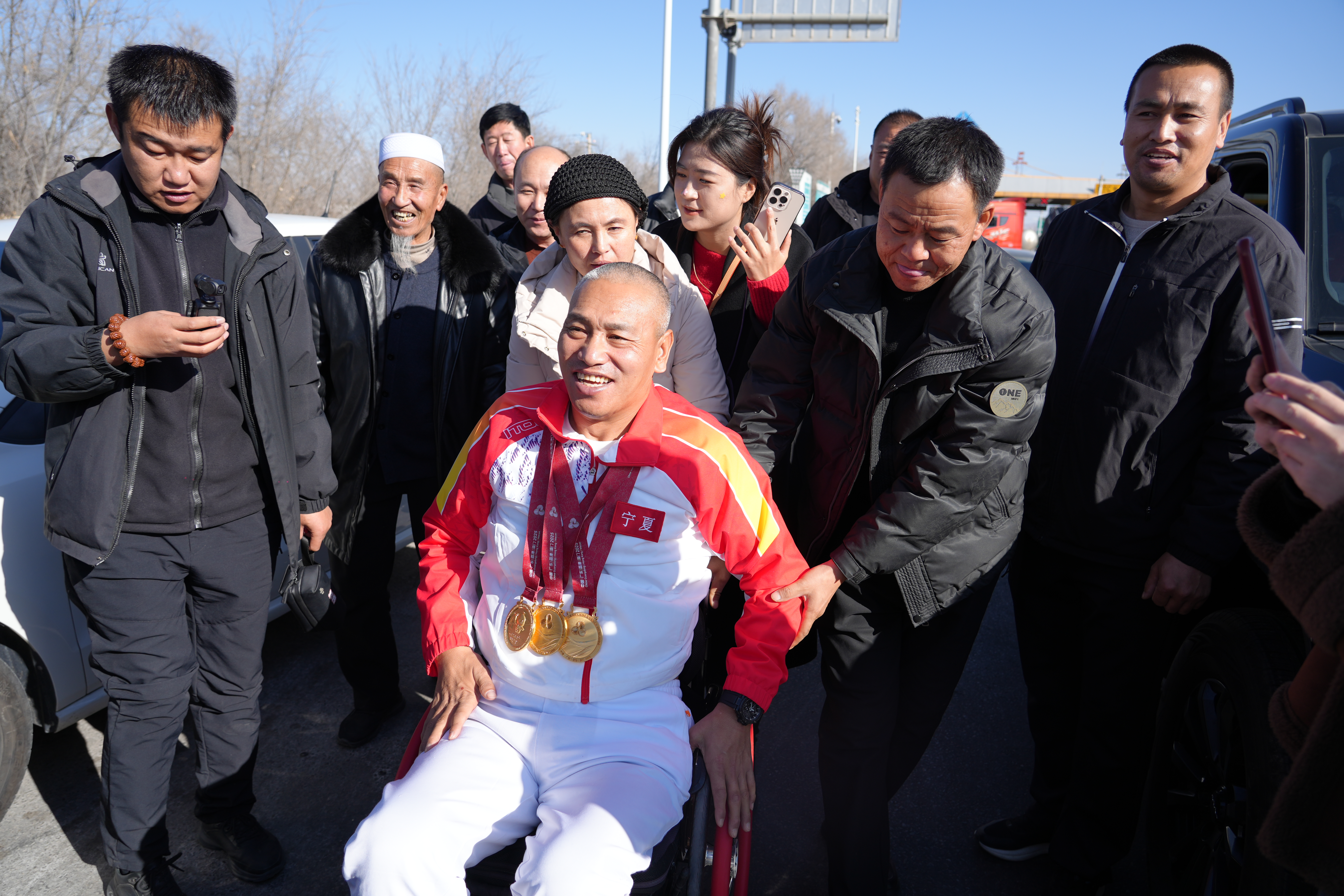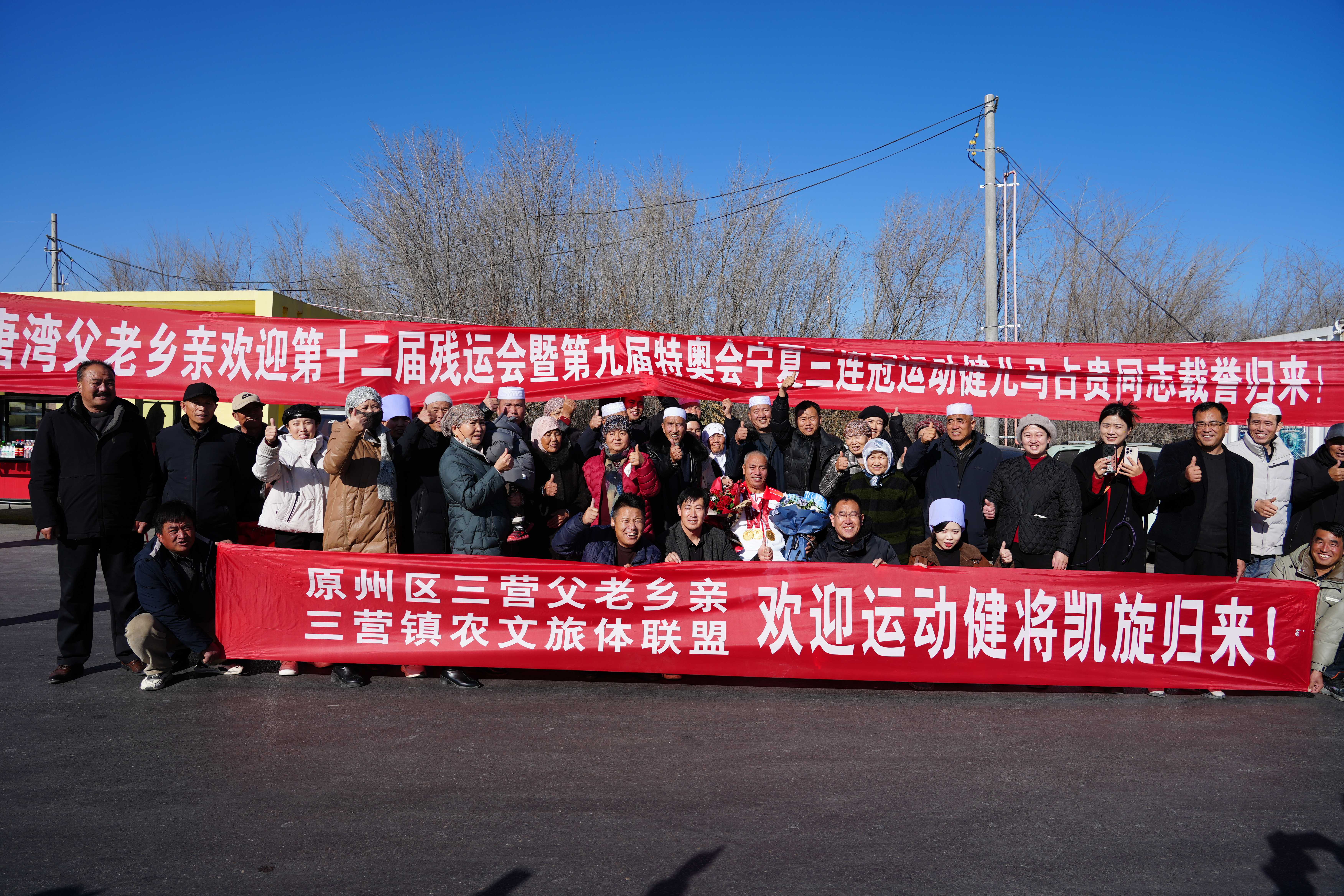 “这是乡亲们的心意,你给咱们争了光,大家都为你自豪。”12月17日上午,在三营高速出口,三营农文旅体联盟代表田志正将自制的奖杯和慰问金送到马占贵手里。奖杯上,“宁夏原州三营运动员马占贵独揽三金”的字样刻着乡亲们滚烫的骄傲。100多名乡亲自发前来迎接马占贵。