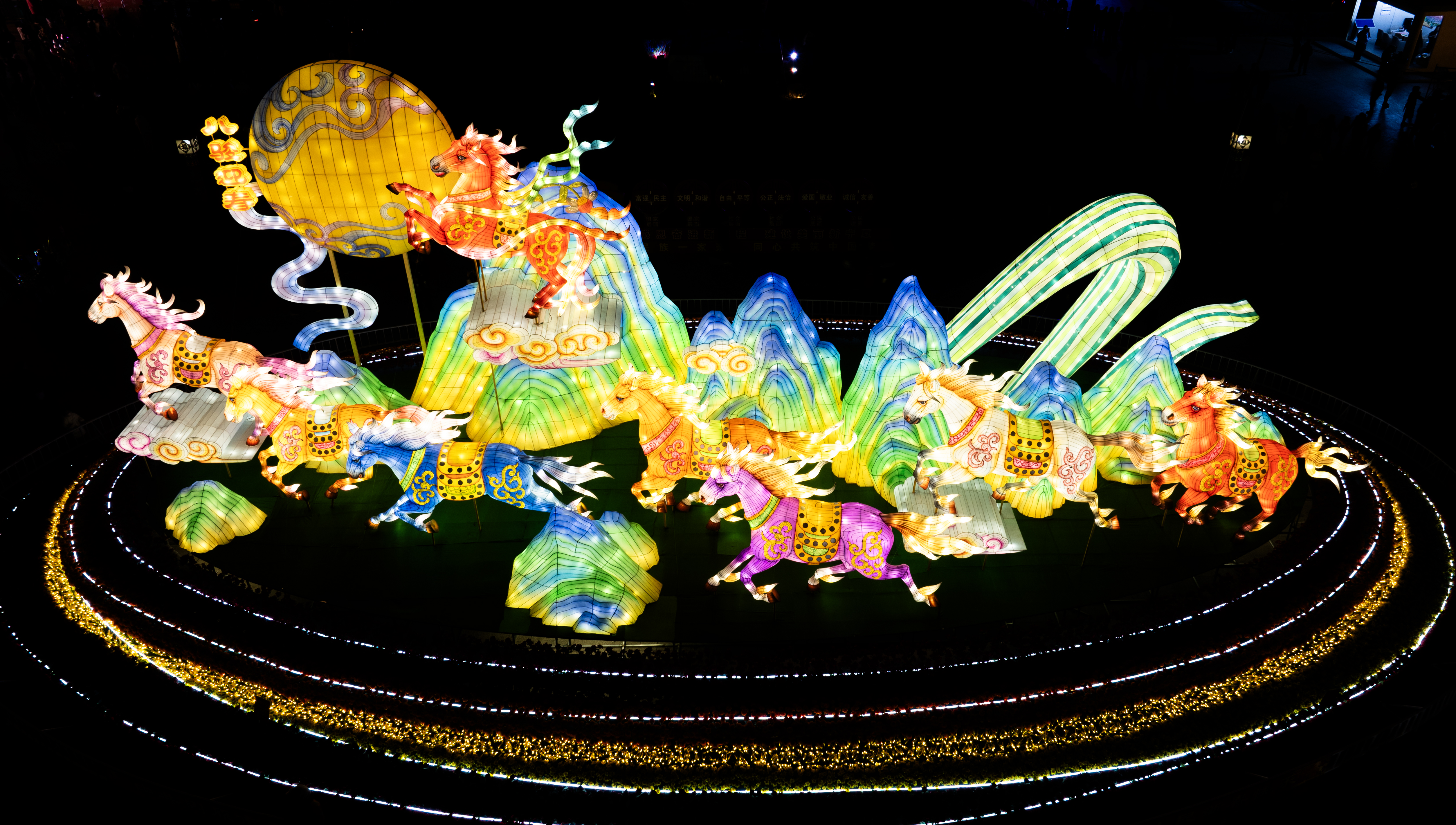 市区各大公园广场成为新春夜景热门打卡地。古雁广场打造“五谷丰登”立体仿真花坛灯组,与西湖公园的精致灯景相映成趣。西湖公园内,樱花灯、太阳花灯、烟花灯点缀枝头,仿古羊皮灯笼悬挂亭间,“我爱固原”打卡点、国潮灯笼墙与发光荷花通道相得益彰,营造出浪漫温馨的节日氛围。固原博物馆广场上,树木被软灯带、动感炫彩灯带环绕装饰,大唐红灯笼高高悬挂,与高8米、长24米、宽10米的“八骏迎春”立体仿真花坛灯组交相辉映。灯组以钢架丝架造型搭配彩色绸缎、点缀仿真花卉,寓意马年奋进、万象更新。“固原博物馆广场的夜景特别有年味,尤其是‘八骏迎春’立体花坛灯组,非常大气漂亮。”市民马勇说。