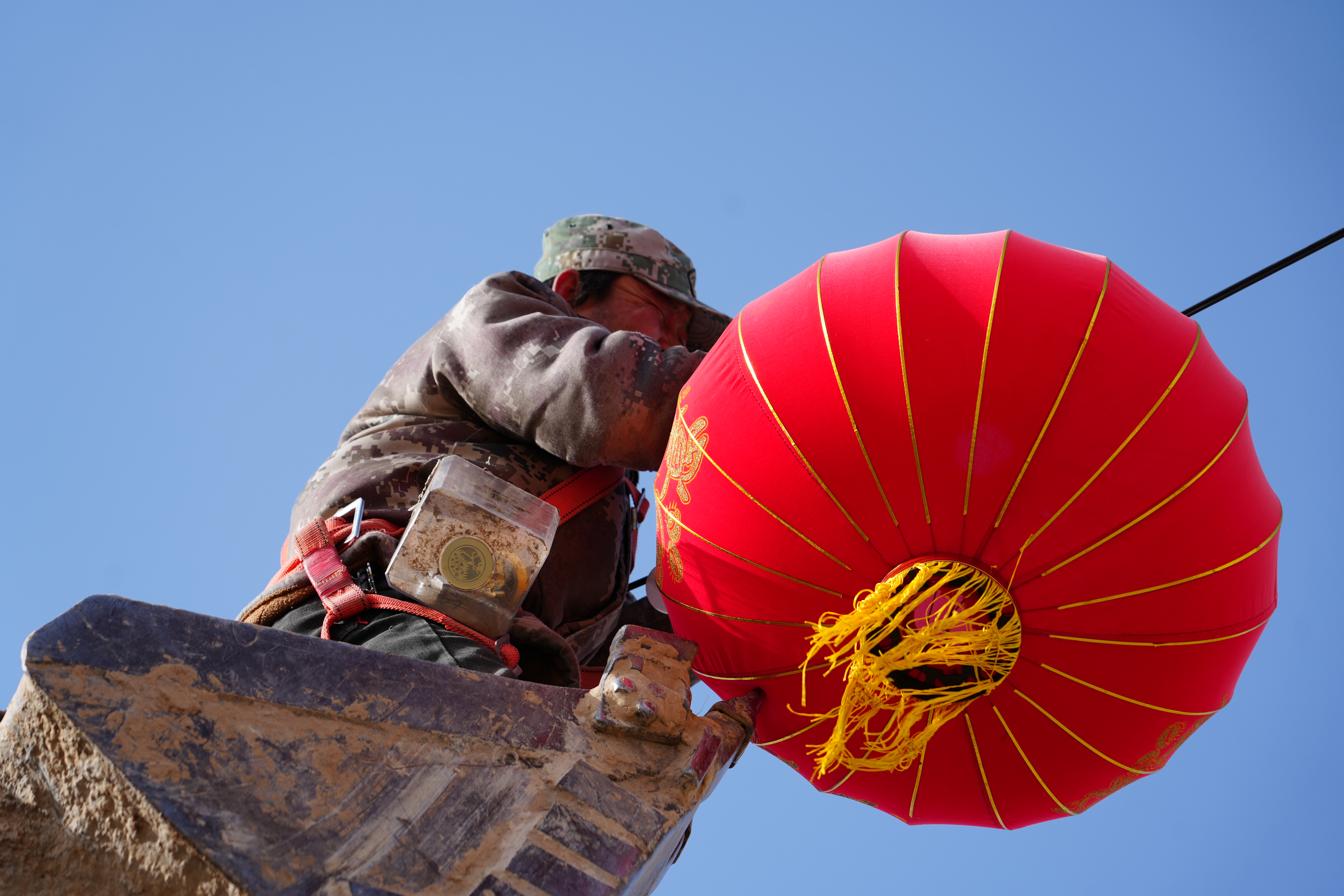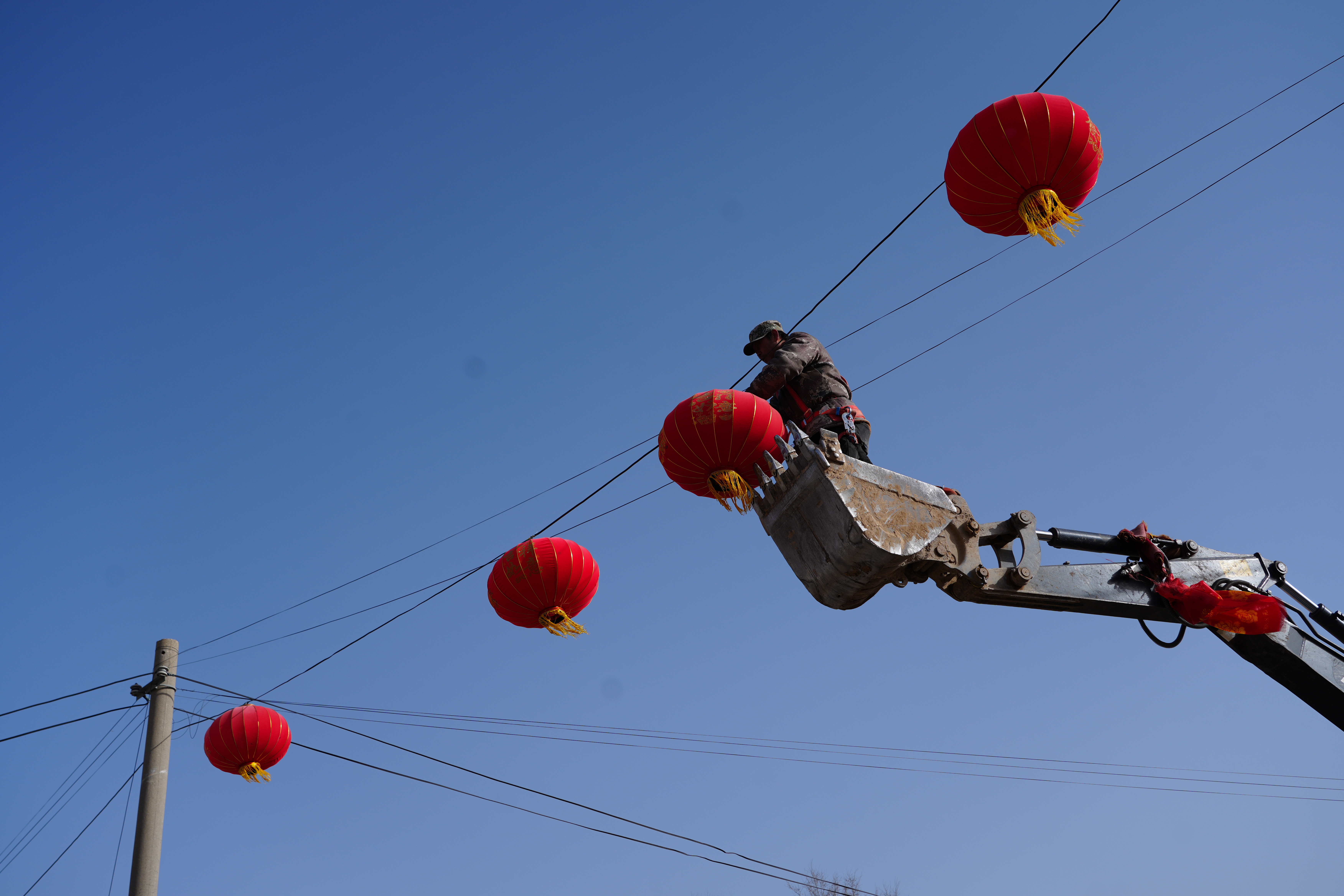 从2月3日开始,每天天刚亮,村头就聚起三四十号人。有六七十岁的老人,有二三十岁的年轻人,扛灯笼、搬梯子、递工具,爬上爬下固定。村里的吊车、铲车都开来了,车主们撂下一句话:“村里的事,不收钱。”