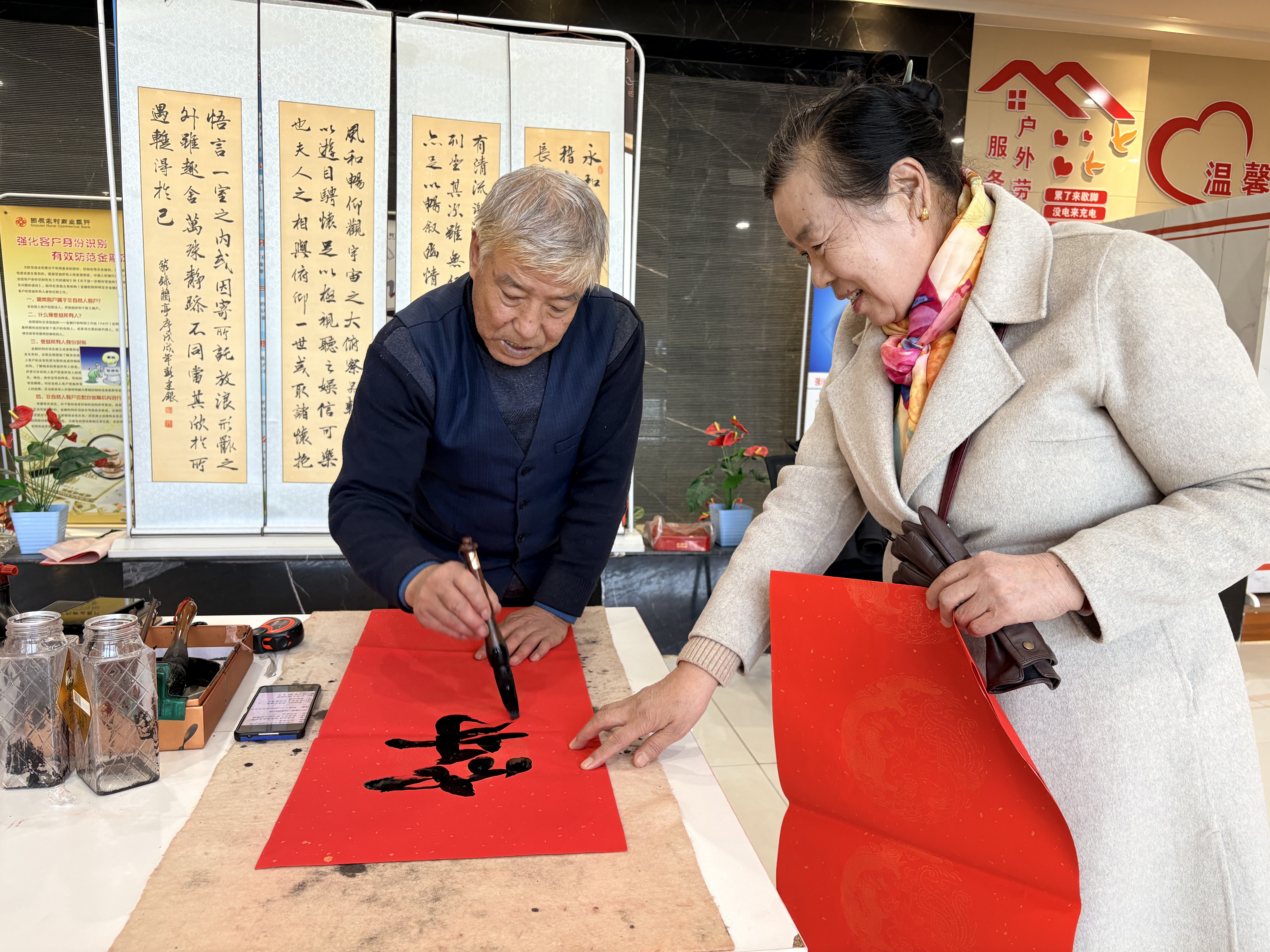 “还是手写的春联有年味儿!”前来办理业务的客户赵阿姨接过一副刚刚晾干的春联,爱不释手。活动现场,工作人员将这些承载着美好祝福的春联赠送给办理业务的客户,让大家在带走资金收益的同时,也带走了一份来自农商行的专属新春祝福。