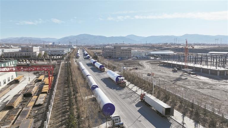 固原经济开发区轻工产业园门口风电装备车辆等待运输