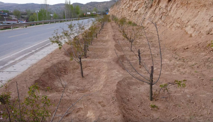在固红公路沿线,整治成效已初步显现。早期修路遗留的土斜坡被修整为阶梯式,为后续种花补绿打下基础;山桃树周边统一开挖方形树池,既规范了路域整体风貌,又便于后期浇水管护。