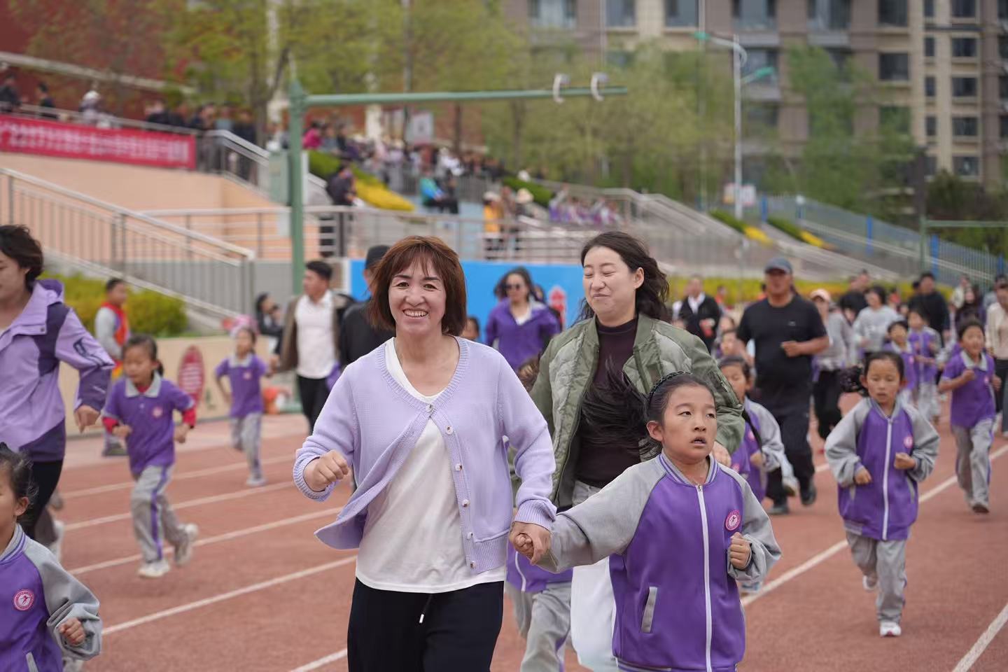 29日下午,赛事率先在校园内启幕,一二年级“星星之火”组亲子选手正式开赛。赛前,带队老师带领学生、家长完成伸展、跳跃等热身动作,稚嫩的脸庞满是期待与朝气。该组别赛道全长1.38公里,学生、家长结伴绕行校园操场与教学楼,依次完成“启航站”“攀登站”“会师站”三个主题打卡节点。赛道沿途,加油声、欢笑声此起彼伏,大手牵小手的温馨画面,成为校园里最动人的春日风景。