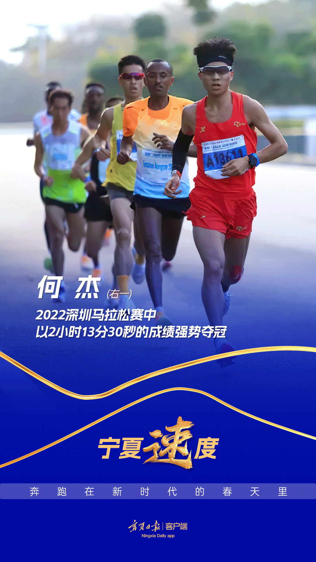 2月19日,2022深圳马拉松赛中宁夏运动员何杰以2小时13分30秒的成绩强势问鼎,力压一众非洲选手,创造深马首次由国内选手夺冠的历史,书写宁夏体育的奇迹,展现宁夏的速度与力量。