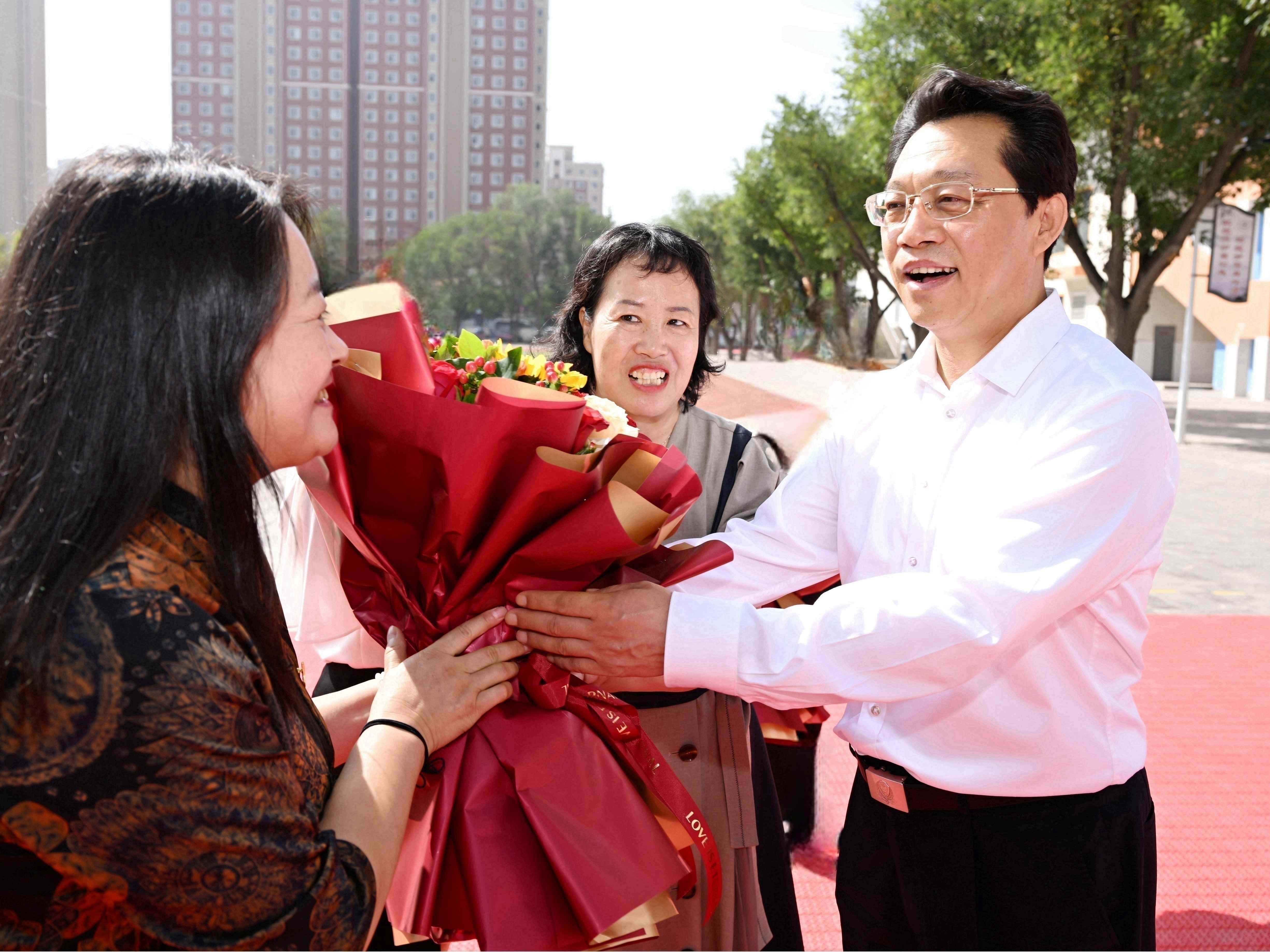 9月10日,梁言顺在宁夏育才中学,与“张振敏名师工作室”的教师代表交流,并送上鲜花和祝福。
