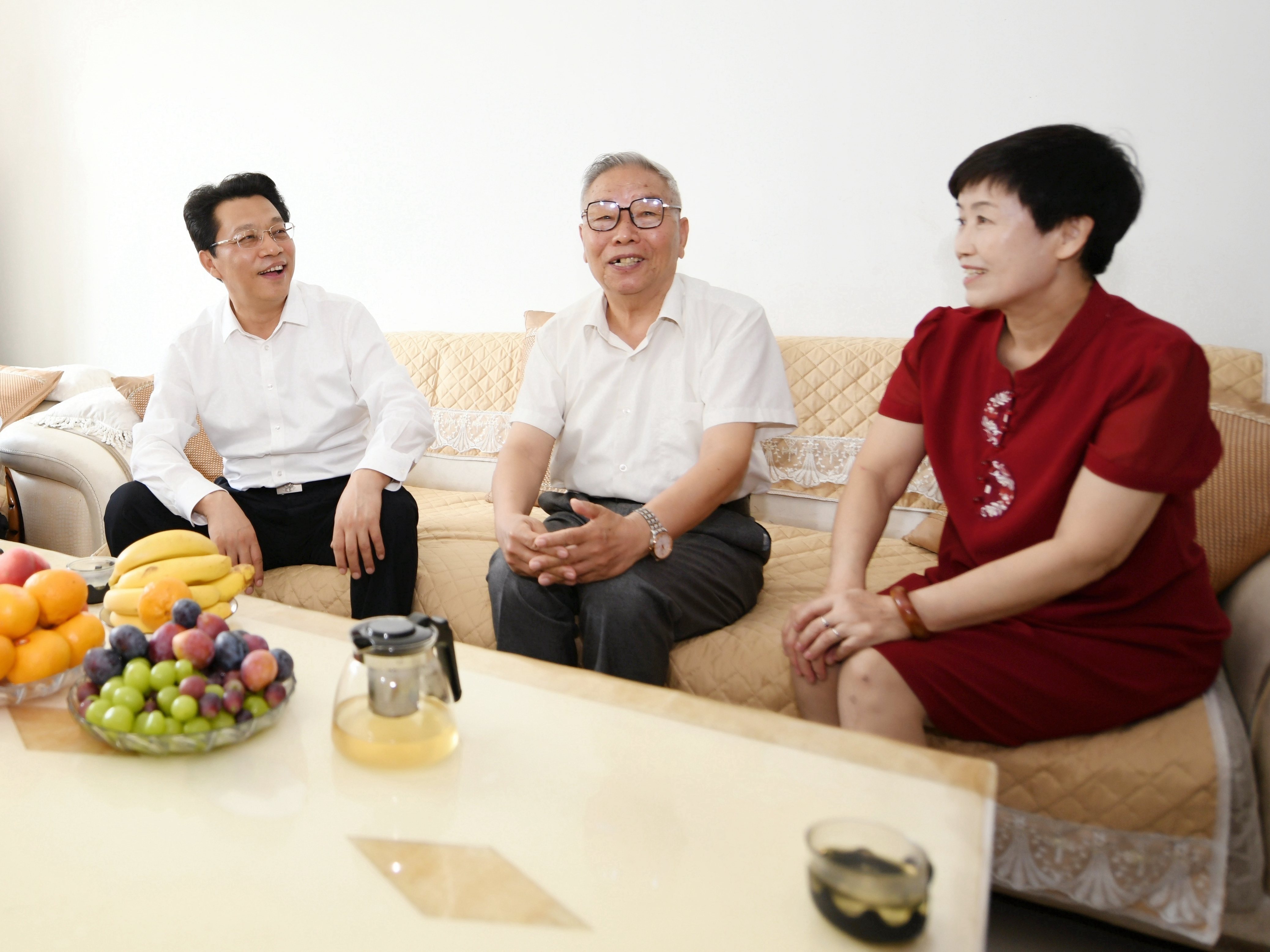 张雨浦看望慰问现年75岁、从教40年的退休教师代表段江淮(中),感谢他为教育事业作出的贡献。