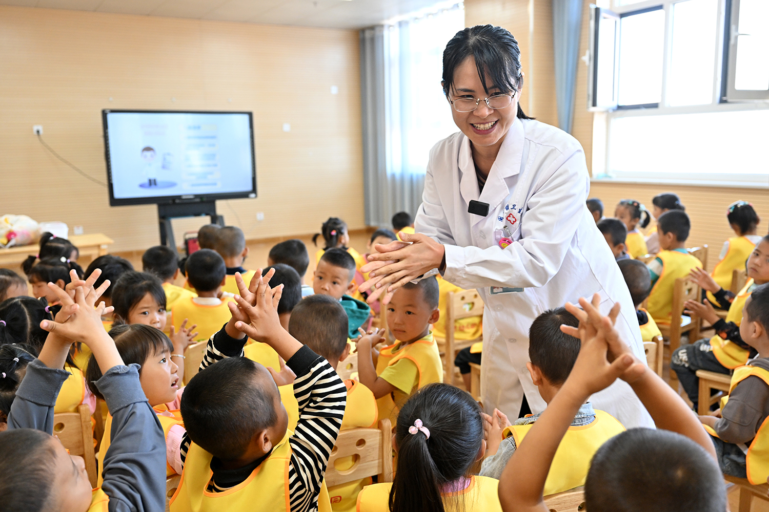2023年9月14日,援宁医疗队队员张秀喜在离开宁夏前,最后一次来到永宁县木兰幼儿园,为这里的孩子们讲授秋季传染病预防知识,她教得耐心,孩子们也学得认真。宁夏日报记者 左鸣远 摄