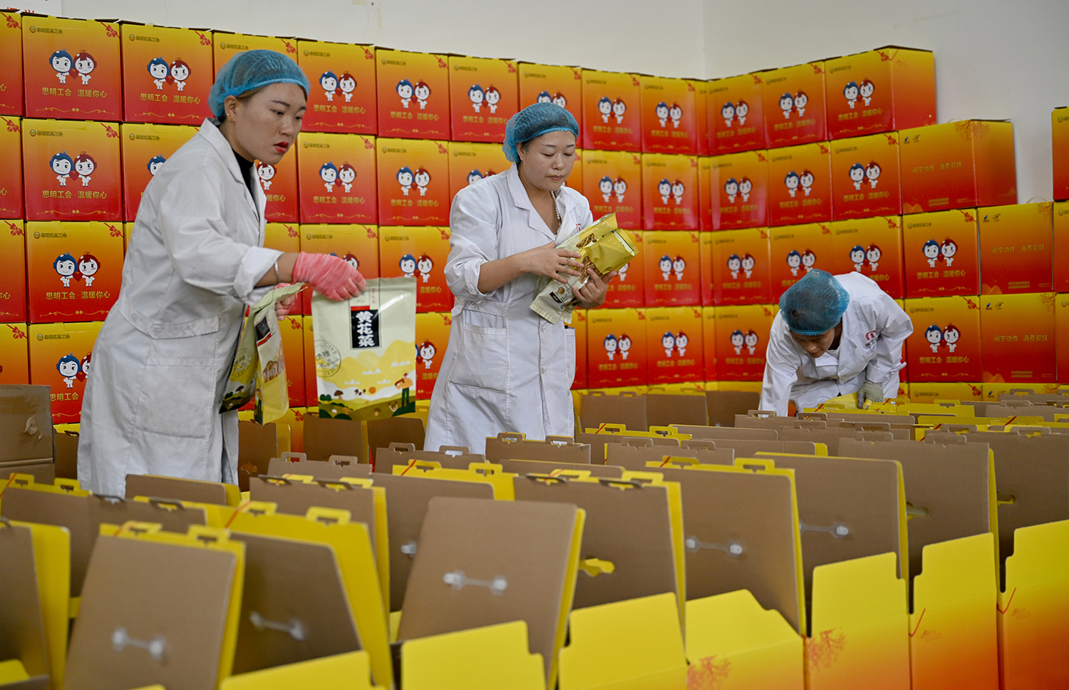在闽宁禾美电商扶贫车间内,员工正在为带货主播销售的商品配货。宁夏日报记者 左鸣远 摄
