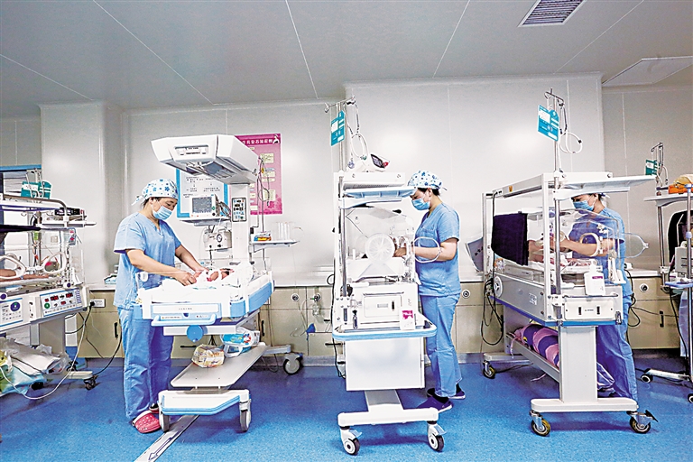 医生给新生儿做保健。医疗服务贴心高效,四级卫生健康服务网络不断完善。