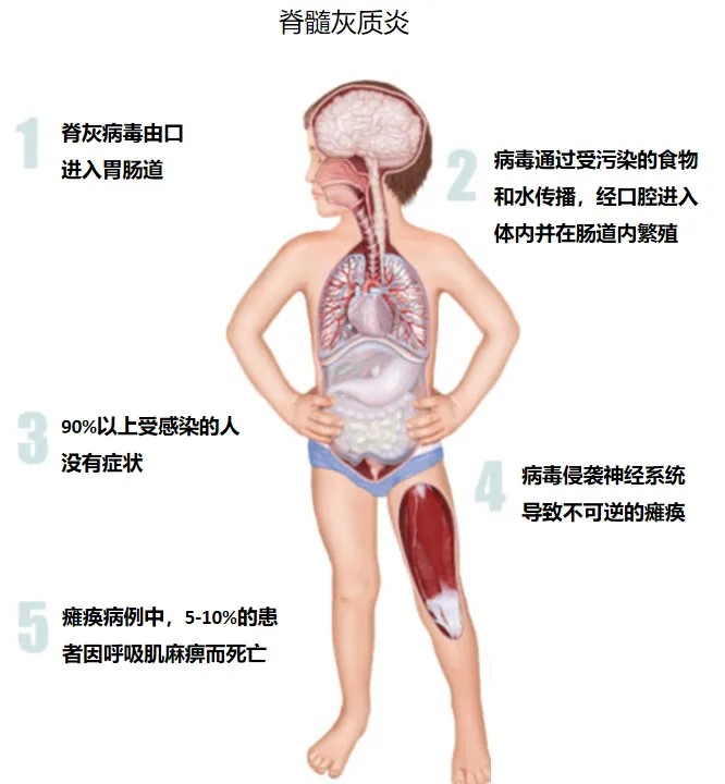 脊髓灰质炎是由脊灰病毒(包含Ⅰ型、Ⅱ型、Ⅲ型)所致的、以肢体呈现不对称麻痹为主要临床表现的急性肠道传染性疾病,感染病毒发病后会导致机体永久性损伤,主要侵害5岁以下儿童,俗称为小儿麻痹。