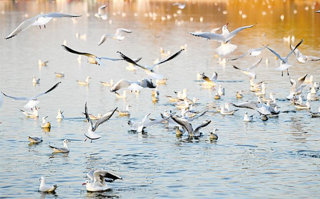 曾经的南湖如“一潭死水”,多年后的今天,南湖水变清澈了,岸上岸下草木长势喜人,遗鸥、赤麻鸭、白骨顶鸡等30余种珍贵鸟类经常邂逅南湖。