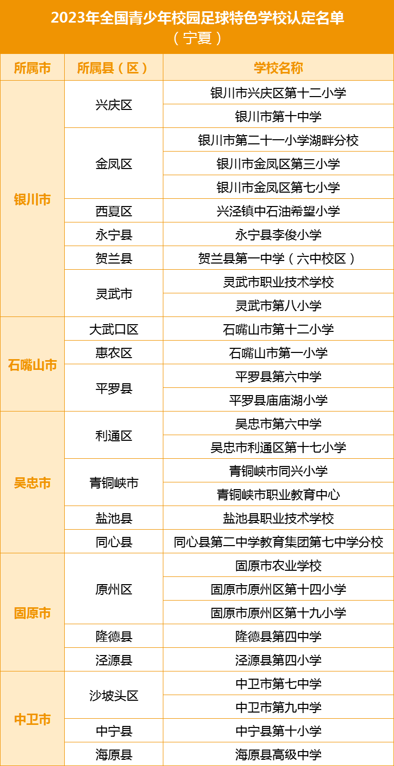 近日,教育部办公厅公布2023年全国青少年校园足球特色学校名单,宁夏五市的29所中小学校入选,一起看名单——