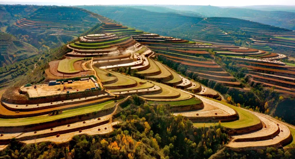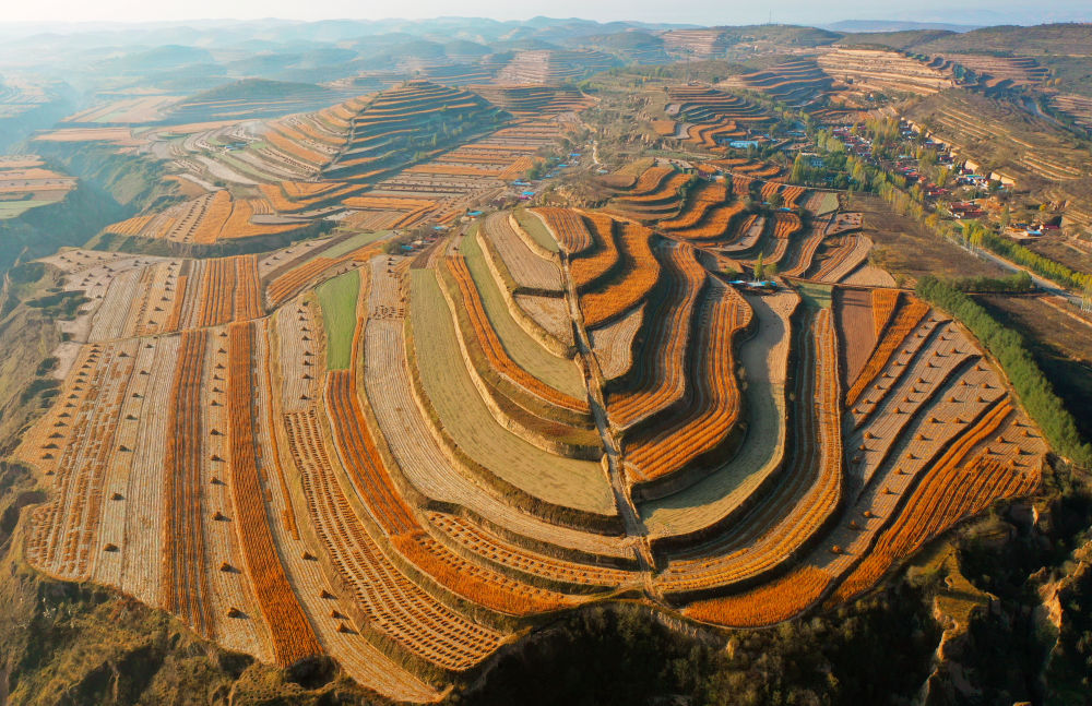深秋时节的彭阳县,随处爬上一座山都能收获一幅如画美景:各种植被高低错落,层层叠叠铺满山间梯田,好似打翻了大自然的调色盘,泼出一层深绿、一层浅金、一层橙红,从高空俯瞰,就像一圈圈多彩缎带从山脚盘绕至山尖。
