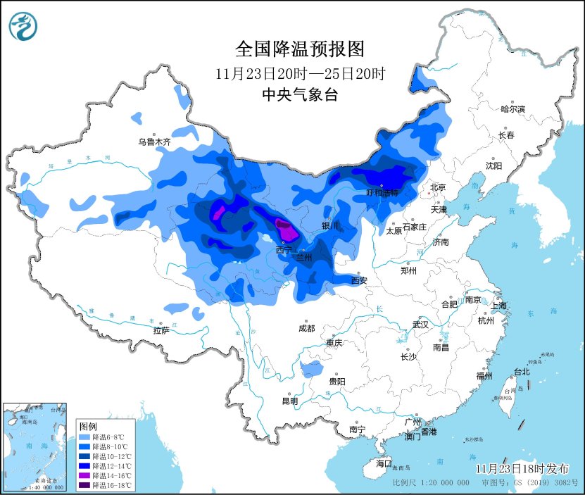 预计,11月23日20时至11月25日20时,新疆东部、内蒙古西部和中部、青海、甘肃、宁夏、陕西西部和北部、山西北部、河北西北部等地将先后降温6~10℃,其中,甘肃河西、青海北部等地部分地区降温可达12℃以上。