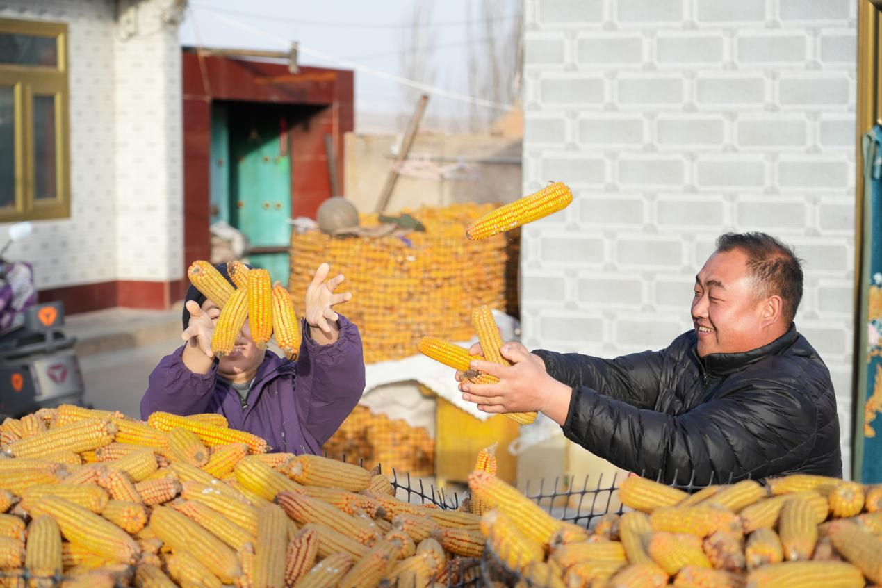 马国礼和妻子将散落的玉米扔入玉米仓中,玉米喜获丰收,不仅为牲畜提供了优质饲料,也为他们带来了可观收益。