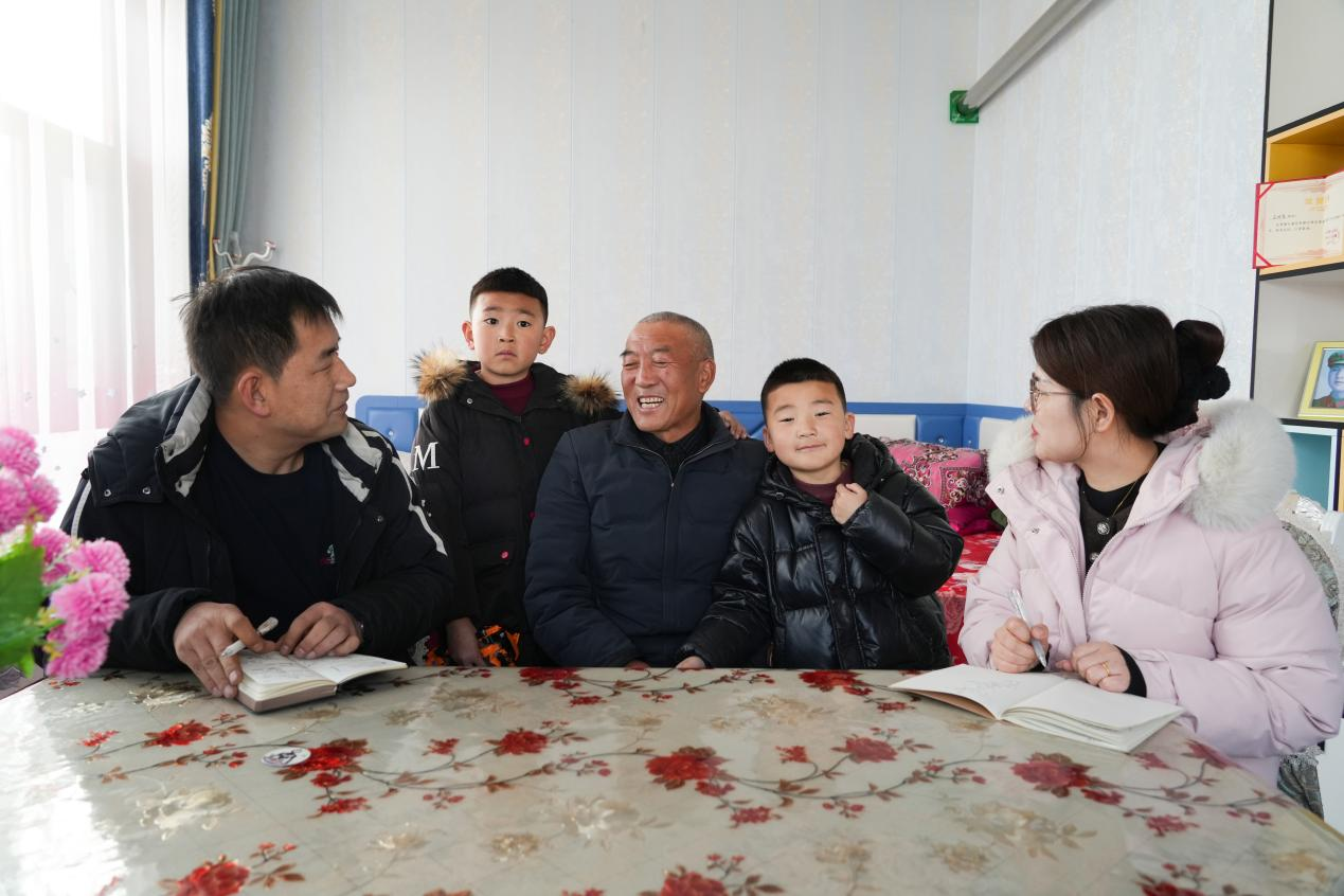 田兴林(左一)在村民马明智(左三)家,关心老人的生活起居。