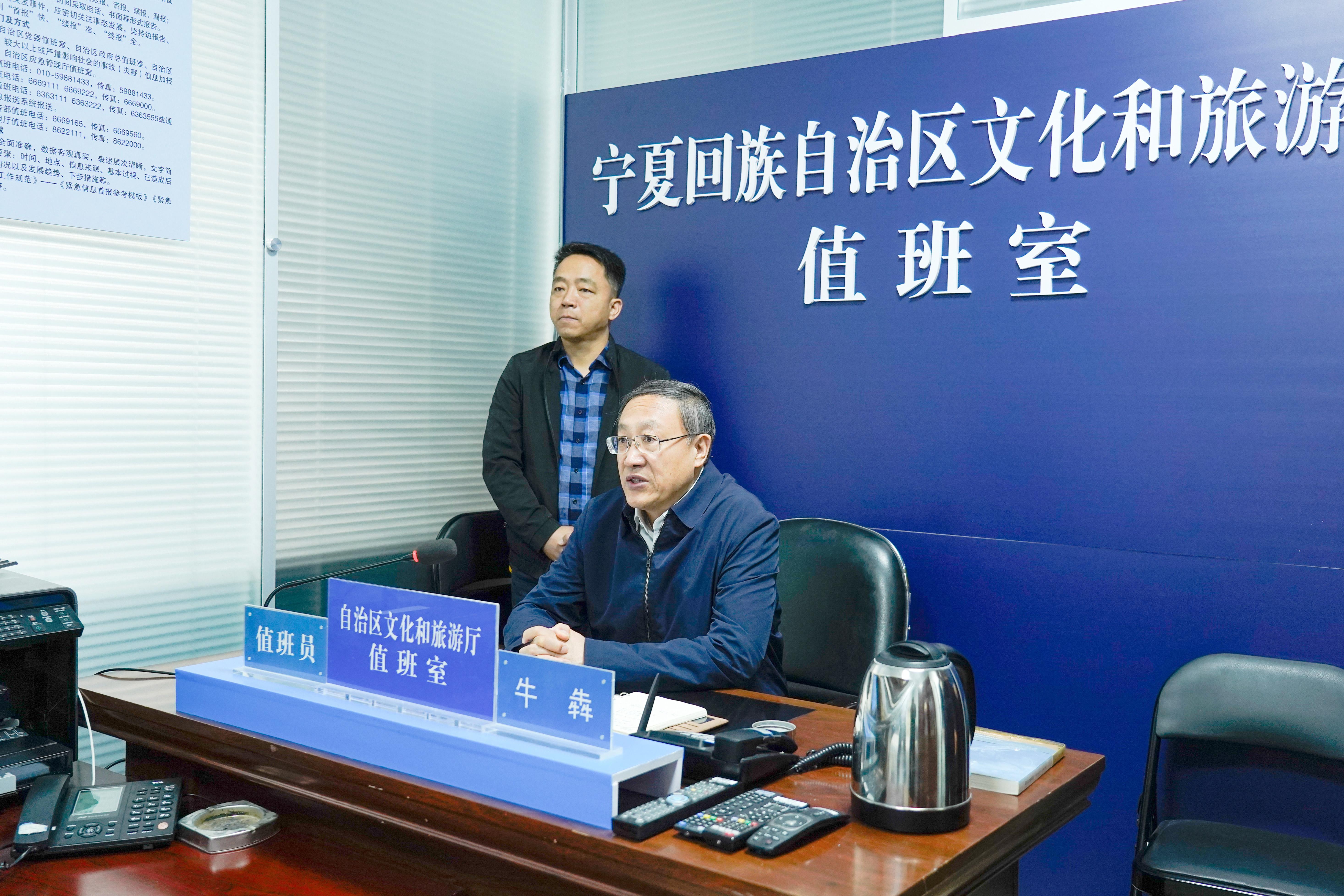 李邑飞在自治区文化和旅游厅值班室,与相关部门视频连线,了解节日期间文旅市场运行情况。