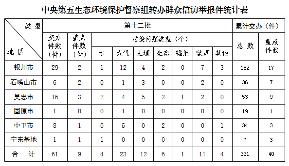 6月10日,中央第五生态环境保护督察组向宁夏回族自治区转办第十二批信访举报件共61件(重点关注件9件),其中来电55件、来信6件。本批次信访举报件涉及银川市29件、石嘴山市6件、吴忠市16件、固原市1件、中卫市8件、宁东基地1件。上述信访举报件已全部及时交办调查处理。