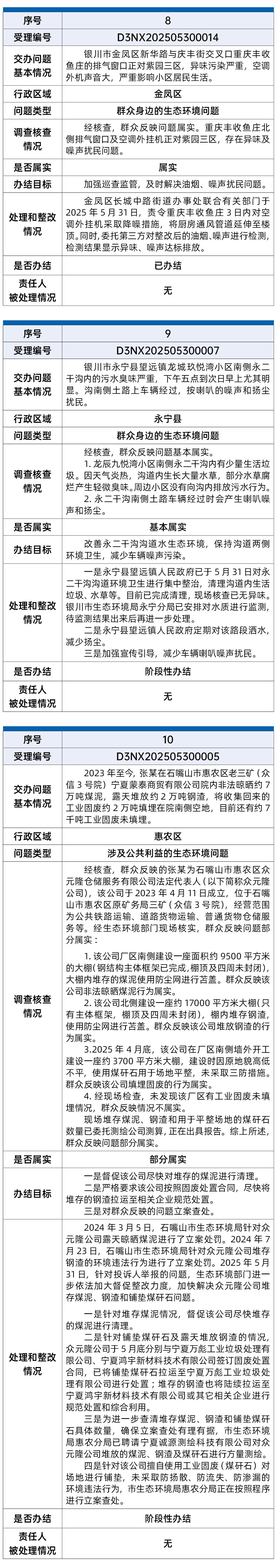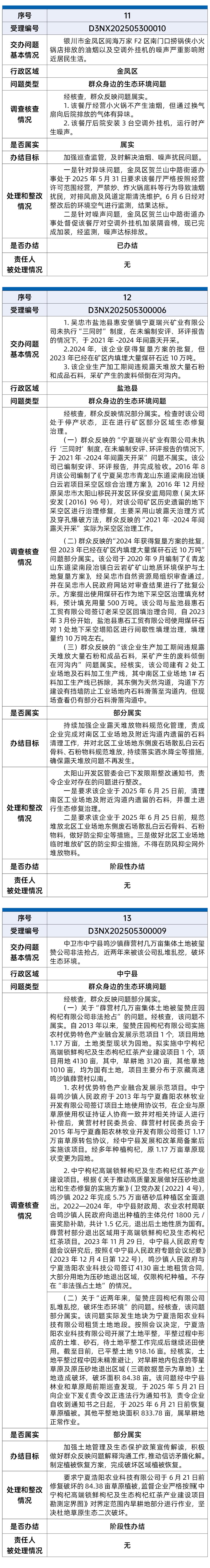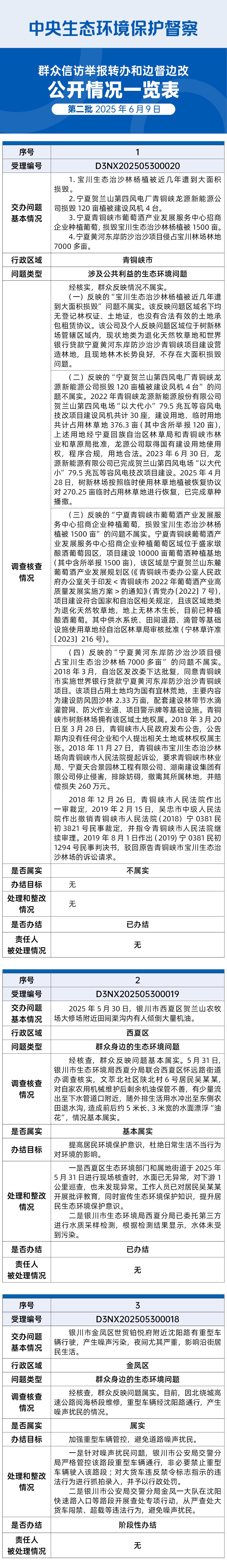 截至6月9日,中央第五生态环境保护督察组向宁夏回族自治区转办的第二批17件信访件,已办结11件,阶段性办结6件。根据督察要求,现予以公开。