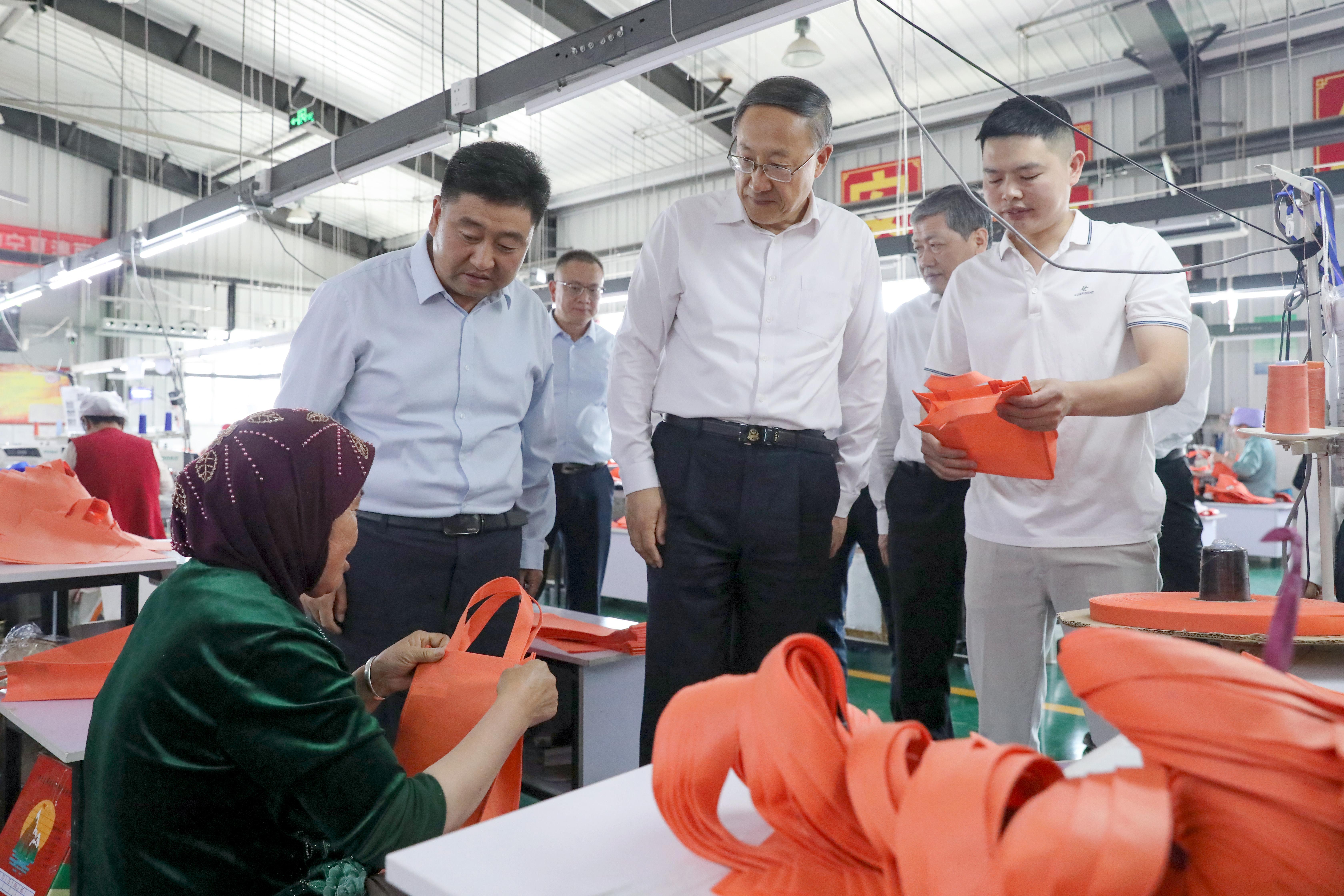 李邑飞在泾源县六盘山镇集美村澳丽妃包袋加工帮扶车间,调研群众就近就业情况。固原市新闻传媒中心记者王旭东/图