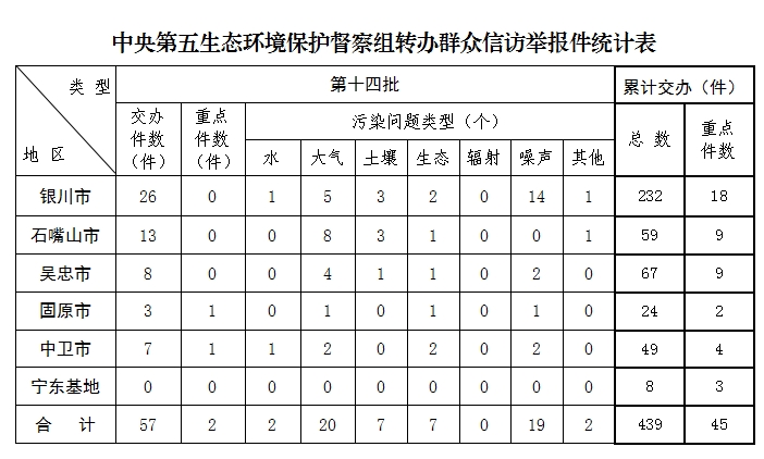 6月12日,中央第五生态环境保护督察组向宁夏回族自治区转办第十四批信访举报件共57件(重点关注件2件),其中来电49件、来信8件。本批次信访举报件涉及银川市26件、石嘴山市13件、吴忠市8件、固原市3件、中卫市7件。上述信访举报件已全部及时交办调查处理。