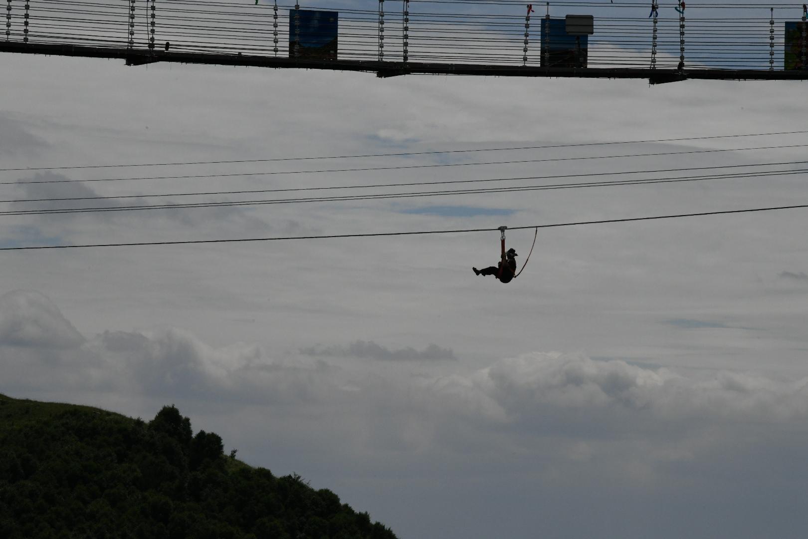 火石寨云台山主峰金顶处,一位游客正在乘滑索过山谷。