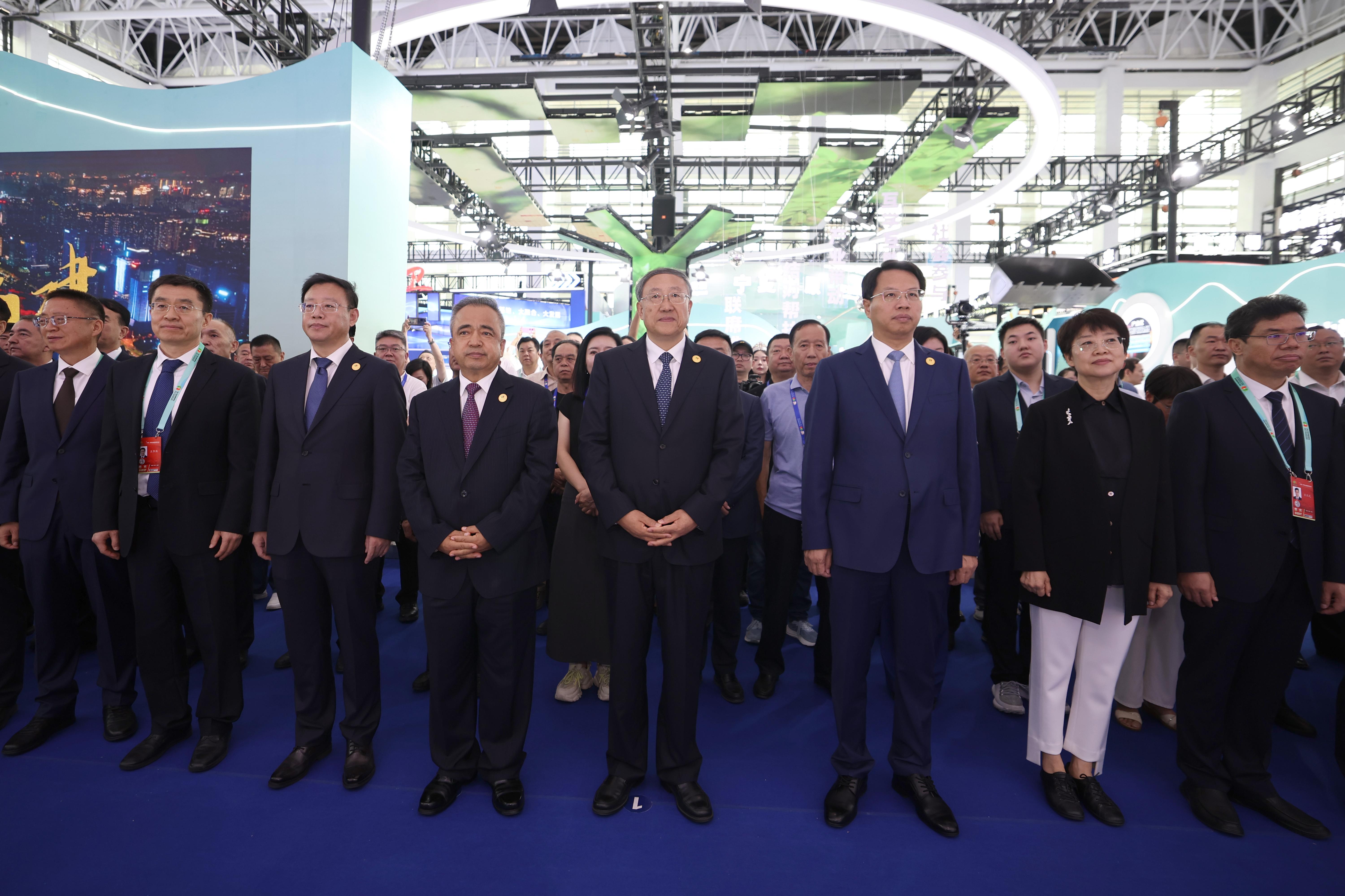 12时30分,李邑飞、艾尔肯·吐尼亚孜共同启动激光柱,为新疆馆开馆,并和与会嘉宾参观展厅,近距离感受新疆在经贸、科技、文旅等领域取得的丰硕成果。