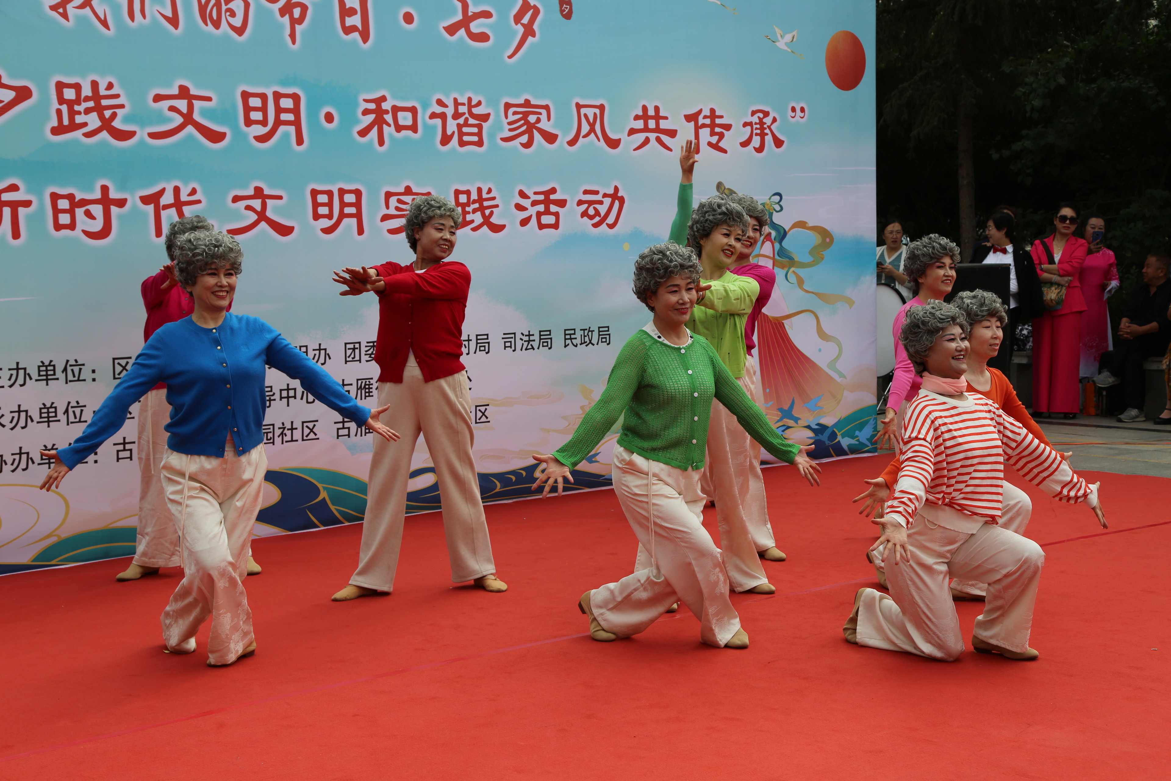 活动在激昂的开场鼓《龙腾盛世》中拉开帷幕。“全国五好家庭”代表高丽君围绕七夕节的历史渊源、文化内涵及婚俗新风作了宣讲;金婚、银婚夫妇代表分享了相濡以沫、共建和谐家庭的故事,展现了家风传承的力量;青年代表结合自身经历,畅谈对文明婚俗的理解与传承。文艺演出环节精彩纷呈,独唱、小品、舞蹈、诗词朗诵等节目,既富有传统文化韵味,又贴近当代生活,赢得观众阵阵掌声。互动环节中,“红线挑战”“趣味投壶”等游戏趣味十足,居民热情参与;猜灯谜、钩织体验、汉服妆造等互动服务区人头攒动;普法宣传、政策咨询等服务贴心到位,现场气氛热烈、欢声不断。本次活动丰富了居民精神文化生活的同时,推动了传统文化与当代文明实践的深度融合,营造了和谐温馨、积极向上的节日氛围。