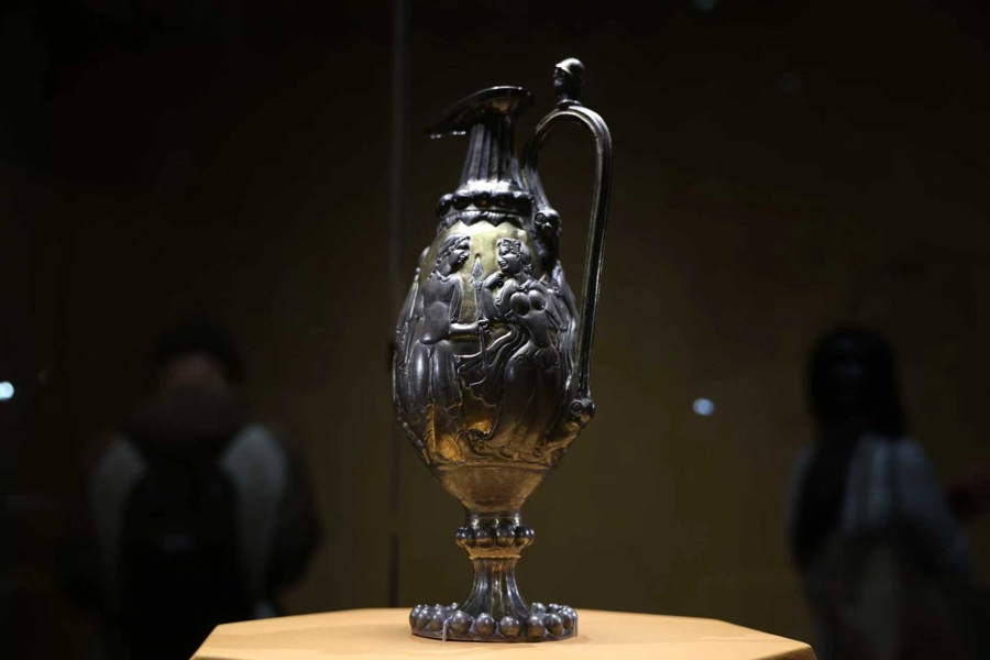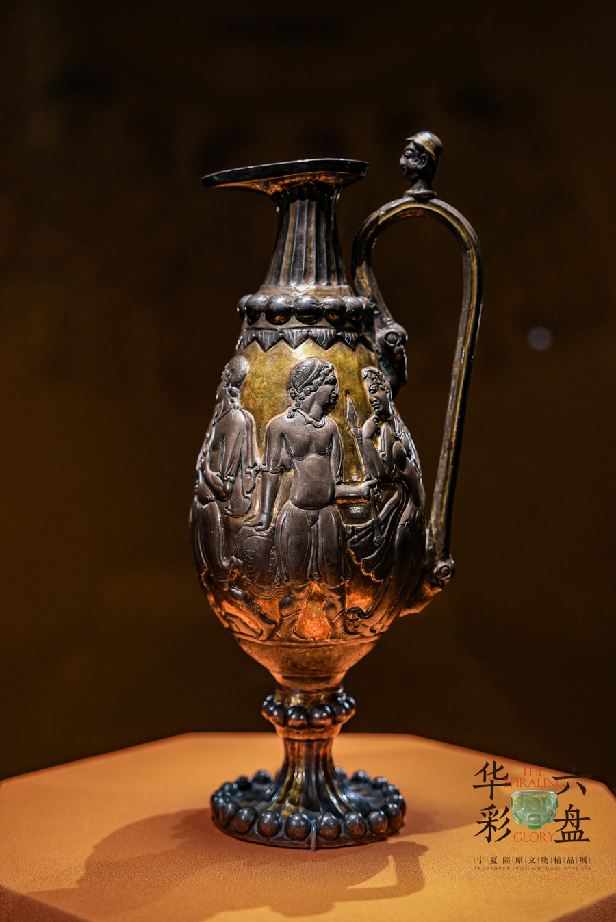 身姿挺拔,上腹细长、下腹圆鼓,通体闪耀华光,壶身层叠的浮雕与环形单把顶端的雕塑,现出深目高鼻的洋人形象……“看起来分明是外国器物!”面对鎏金银壶,观众难免心生疑惑。“混血”感十足的这尊精美银壶,为何出现在中国西北腹地?