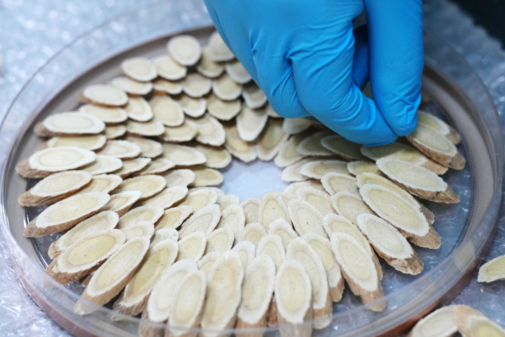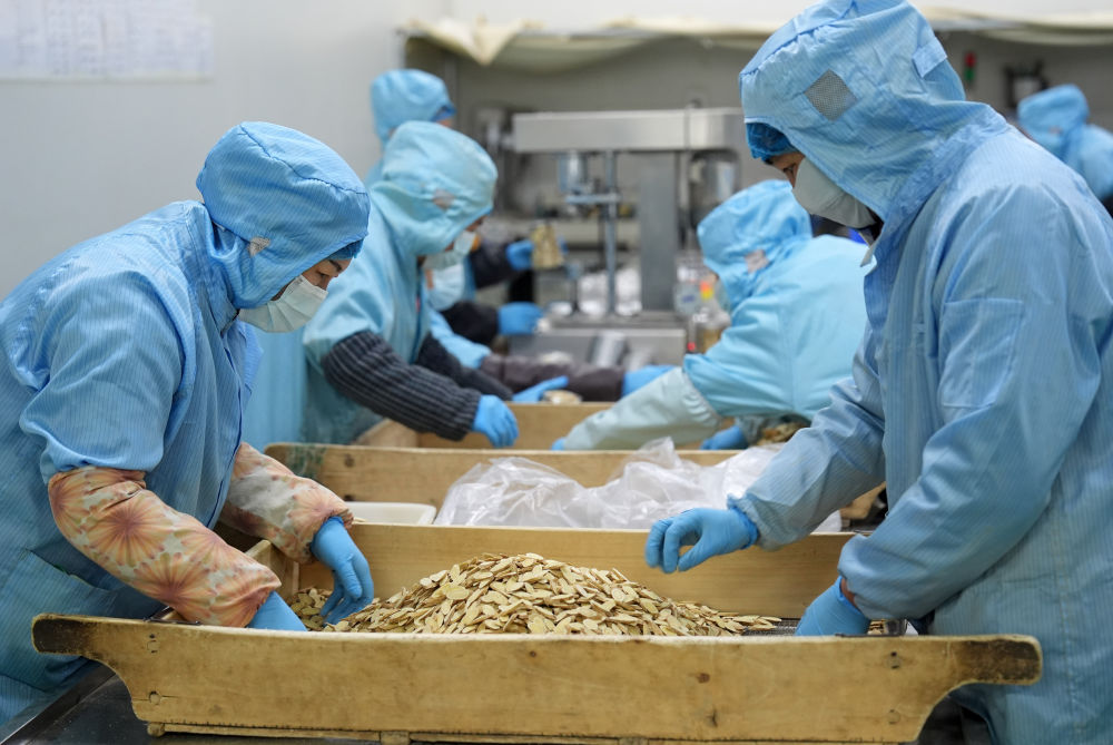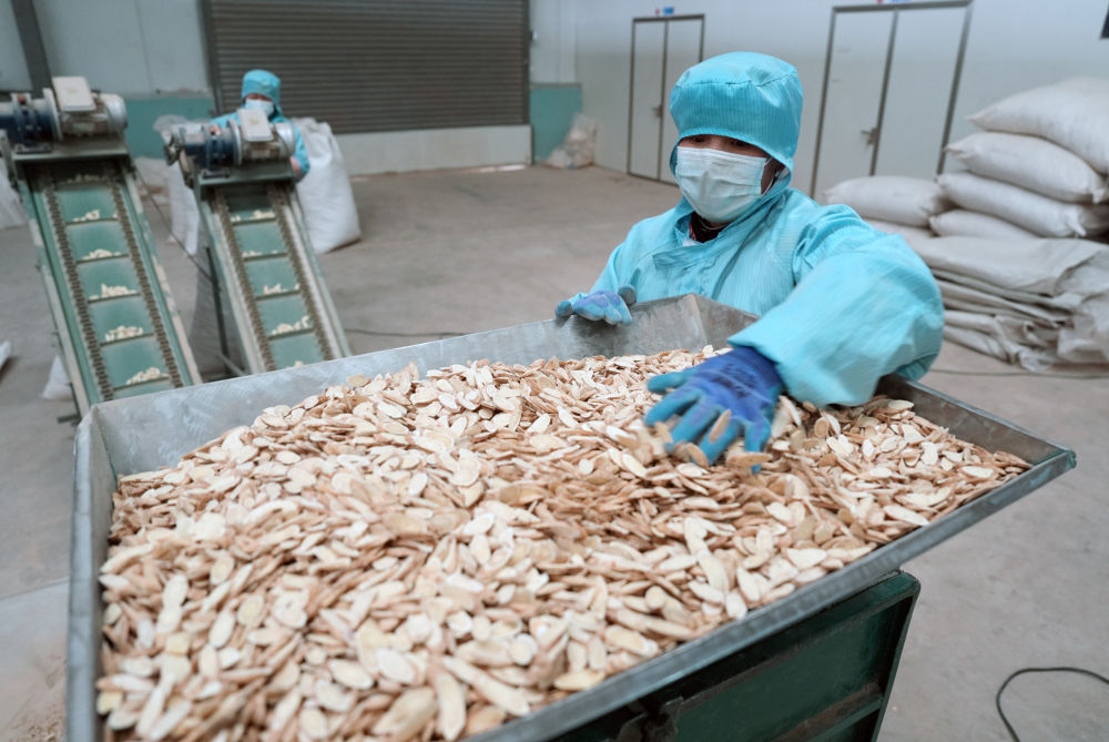 工作人员在宁夏固原市隆德县一家药材加工企业分拣黄芪