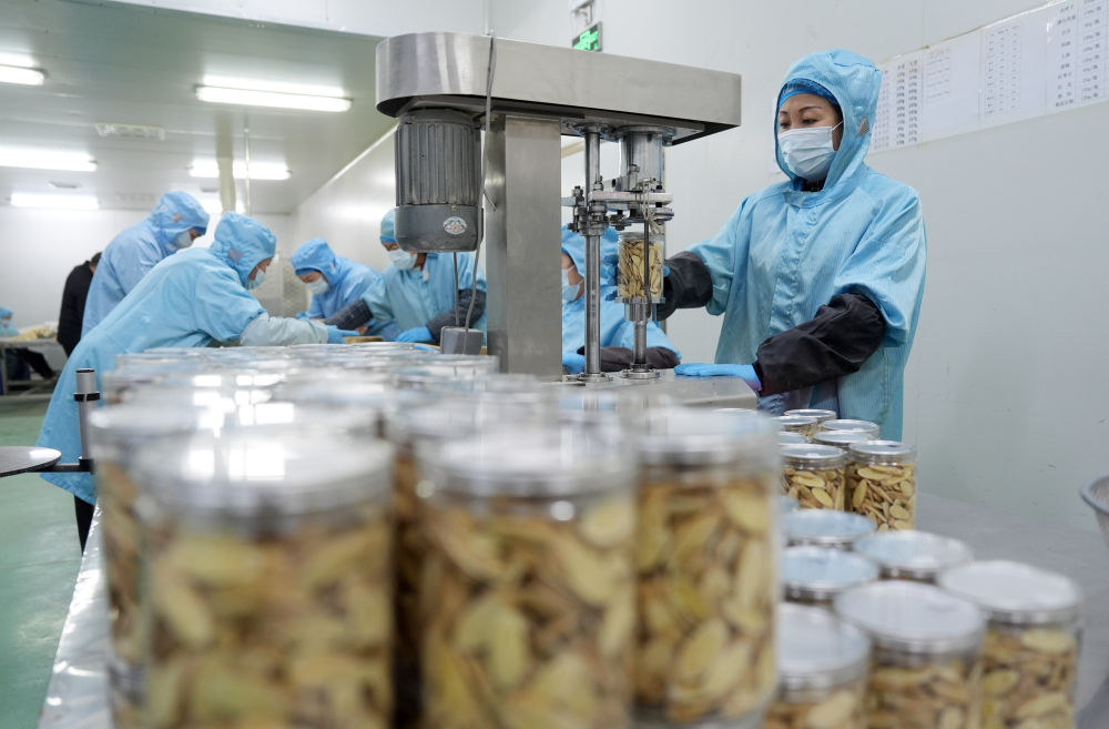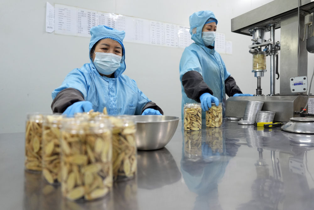 工作人员在宁夏固原市隆德县一家药材加工企业包装黄芪