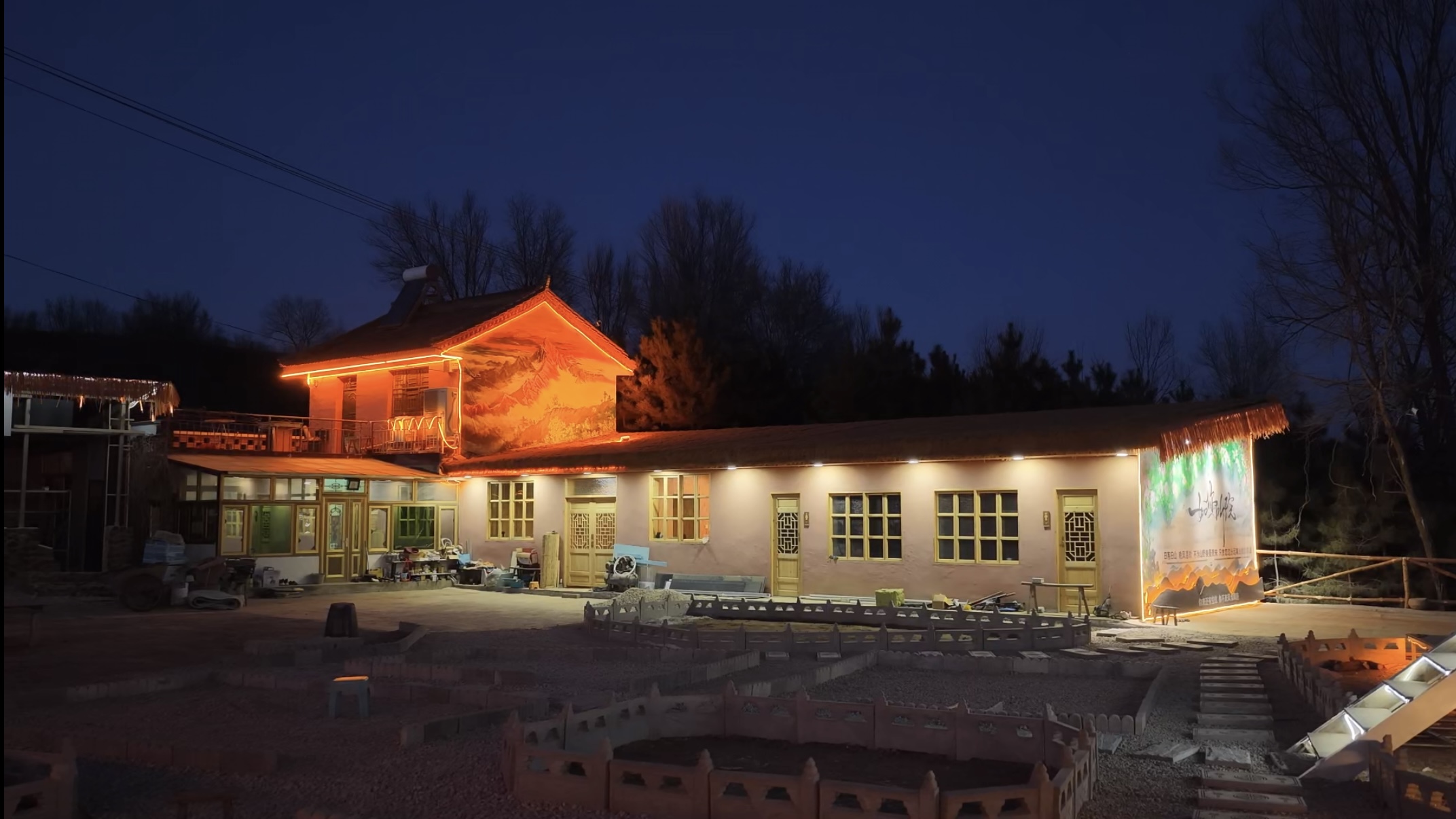 从7月动工至今,老院子的新貌一天天清晰起来,住宿区、烧烤露营区、游乐区和绿化区井然分明,中间还设计有一个小舞台,供游客观影唱歌。而民宿墙壁上的“日照金山”壁画则是院落里一道靓丽的风景,当阳光洒落在壁画上,鎏金的线条流转闪烁,和远处群山的轮廓遥相呼应,仿佛山景漫入院中,又在墙上生长出来。